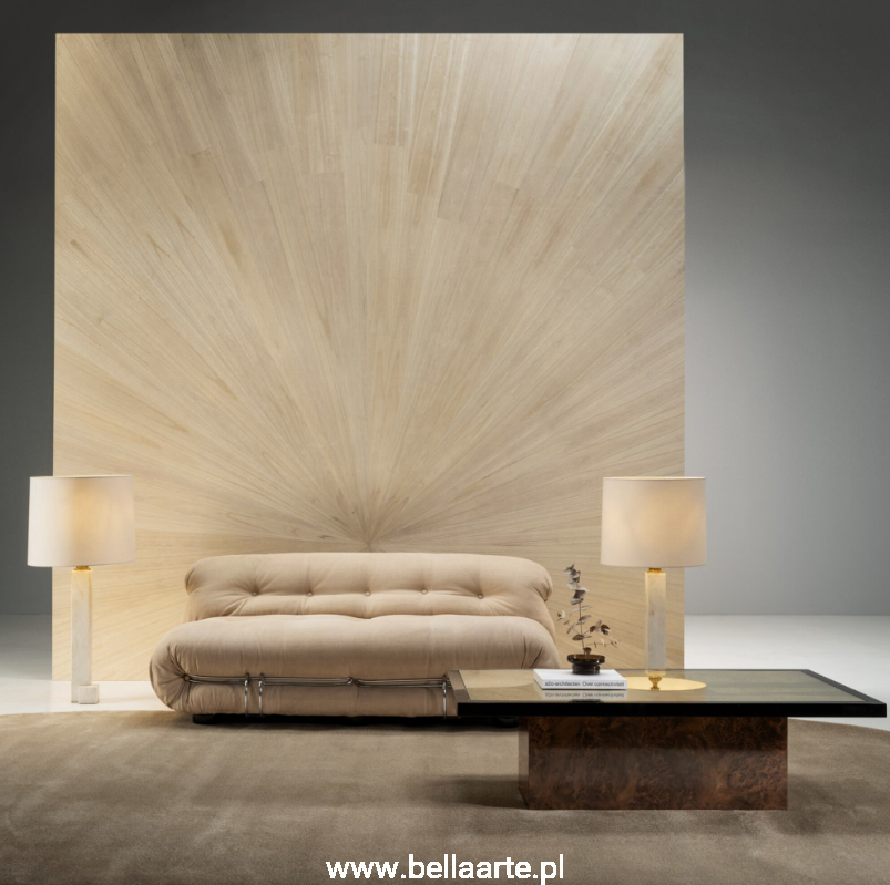 Idealna jako ściana akcentowa w salonie, sypialni lub jadalni. Naturalny fornir wprowadza ciepło i bliskość z naturą, pasuje do wnętrz rustykalnych i boho, a geometryczna, promienista struktura dodaje elegancji i nowoczesnego charakteru. Mural tworzy reprezentacyjne tło w strefie wypoczynku i sprzyja harmonii w sypialni.