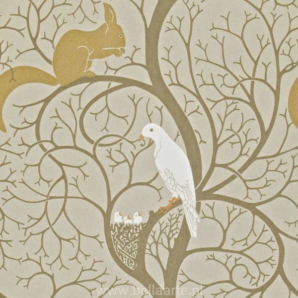 Tapeta Squirrel & Dove to wierna reprodukcja oryginalnego projektu stworzonego przez C.F.A. Voyseya, wybitnego angielskiego architekta i projektanta tekstyliów, znanego również ze współpracy z Williamem Morrisem. Wzór Squirrel & Dove, utrzymany w stylu Arts & Crafts, odzwierciedla estetykę tamtego okresu, charakteryzując się ręcznie rysowanymi motywami przyrody, w tym wiewiórkami i gołębiami. Tapeta została po raz pierwszy wyprodukowana przez firmę Sanderson w latach 90. XIX wieku i do dziś cieszy się popularnością dzięki swojemu historycznemu uroku i artystycznemu kunsztowi. Obecnie wzór Squirrel & Dove jest dostępny zarówno jako tapeta, jak i tkanina, co pozwala na stworzenie harmonijnych i stylowych wnętrz inspirowanych duchem epoki Arts & Crafts.