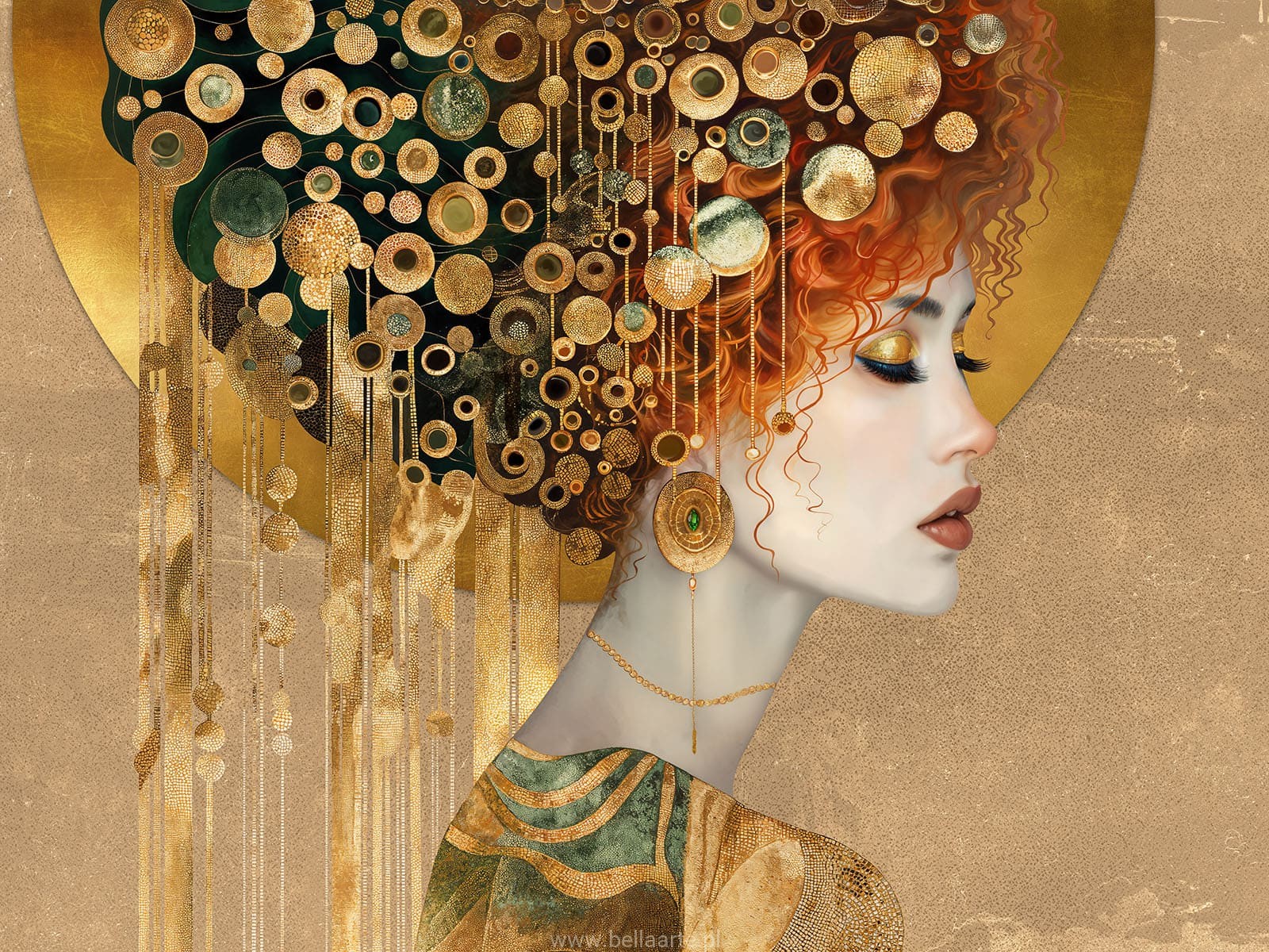 Tapeta Diana to artystyczna kompozycja przedstawiająca twarz kobiety ozdobioną złotymi zdobieniami, które nadają jej luksusowego i eleganckiego charakteru. Złote akcenty subtelnie połyskują na tle, tworząc wrażenie głębi i dodając wnętrzu wyrafinowanego blasku. Wyrazisty wzór doskonale sprawdzi się jako centralny element dekoracyjny w salonie, sypialni czy gabinecie, wprowadzając do przestrzeni artystyczny akcent.