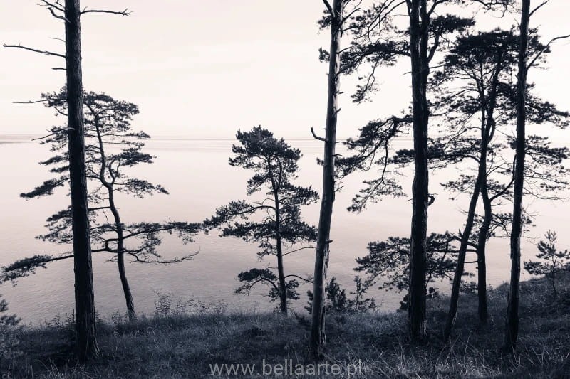Pokojowa zdjęciowa fototapeta, przedstawiająca odważne drzewa sosnowe z widokiem na ocean. Fototapeta sprzedawana na wymiar ściany. Cena dotyczy metra kwadratowego fototapety.