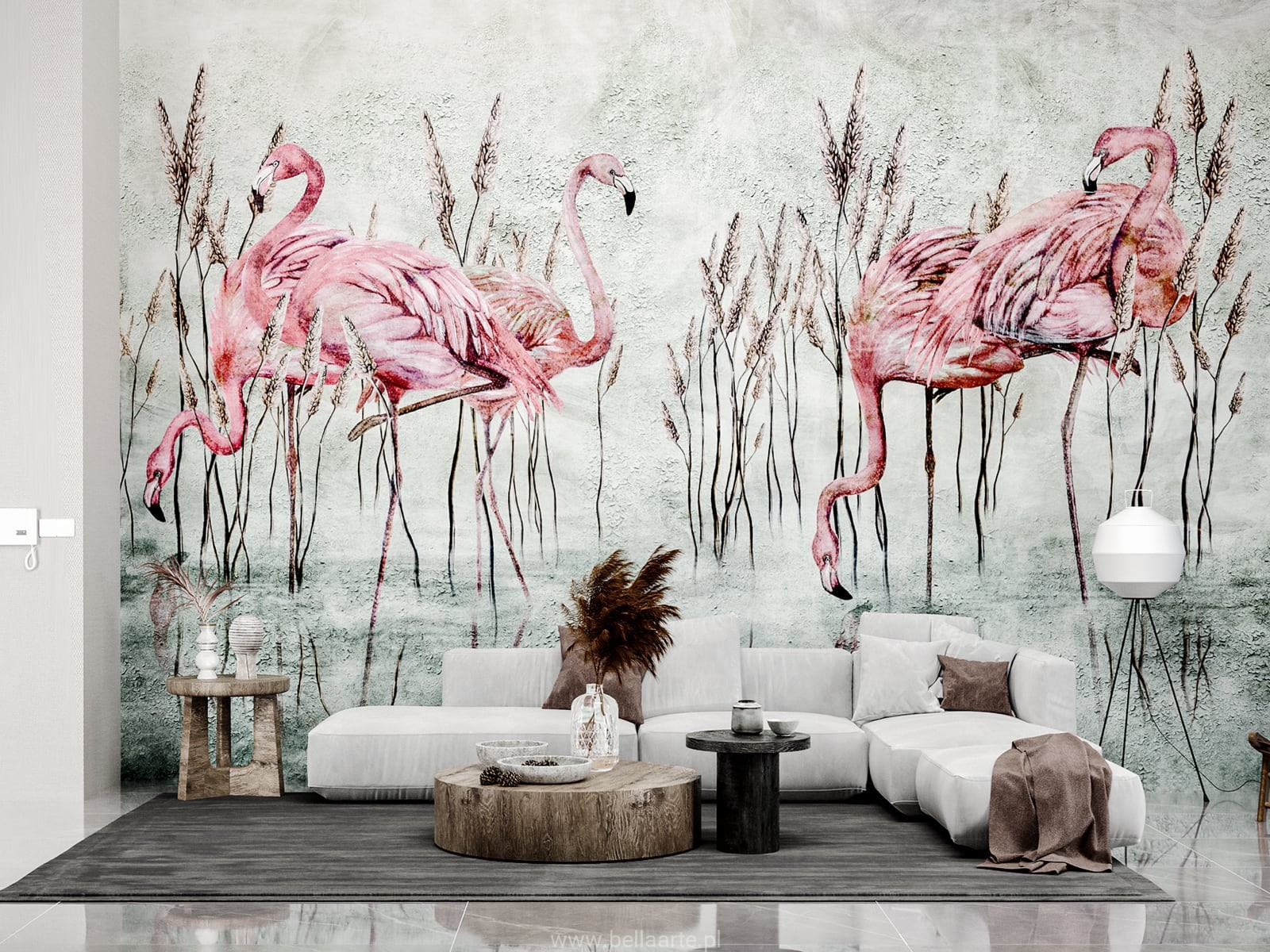 Tapeta Fenicottero od Wallcraft to elegancka kompozycja, która przenosi nas w egzotyczny świat natury. Przedstawiająca różowe flamingi brodzące w dzikim stawie, otoczone trzciną, tapeta wnosi do wnętrza subtelną harmonię i egzotyczny urok. Jej elegancki wzór doskonale dopełnia nowoczesne aranżacje, nadając pomieszczeniu unikalny charakter i styl.