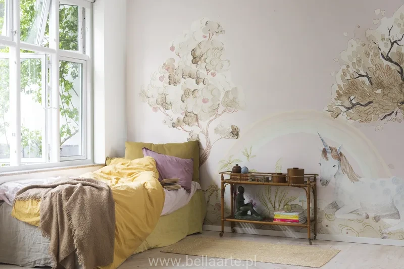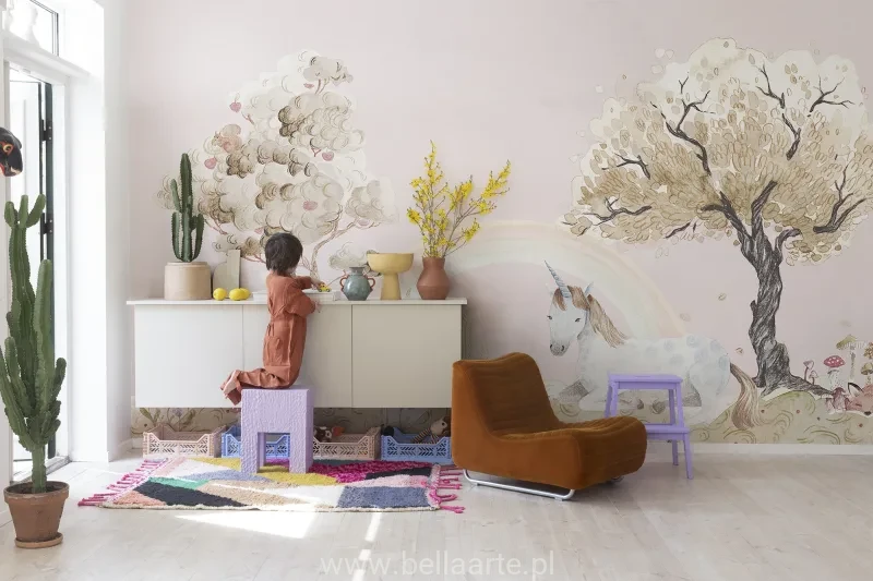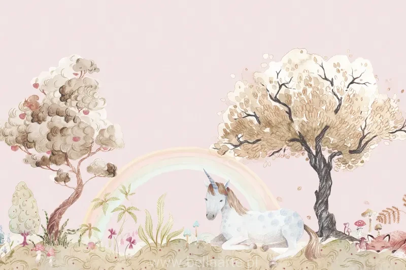 Fototapeta o błyszczących jednorożcach, drzemiących lisach i magicznych tęczach, fototapeta szwedzkiego producenta drukowana jest na wymiar ściany, minimalne zamówienie 3 m²