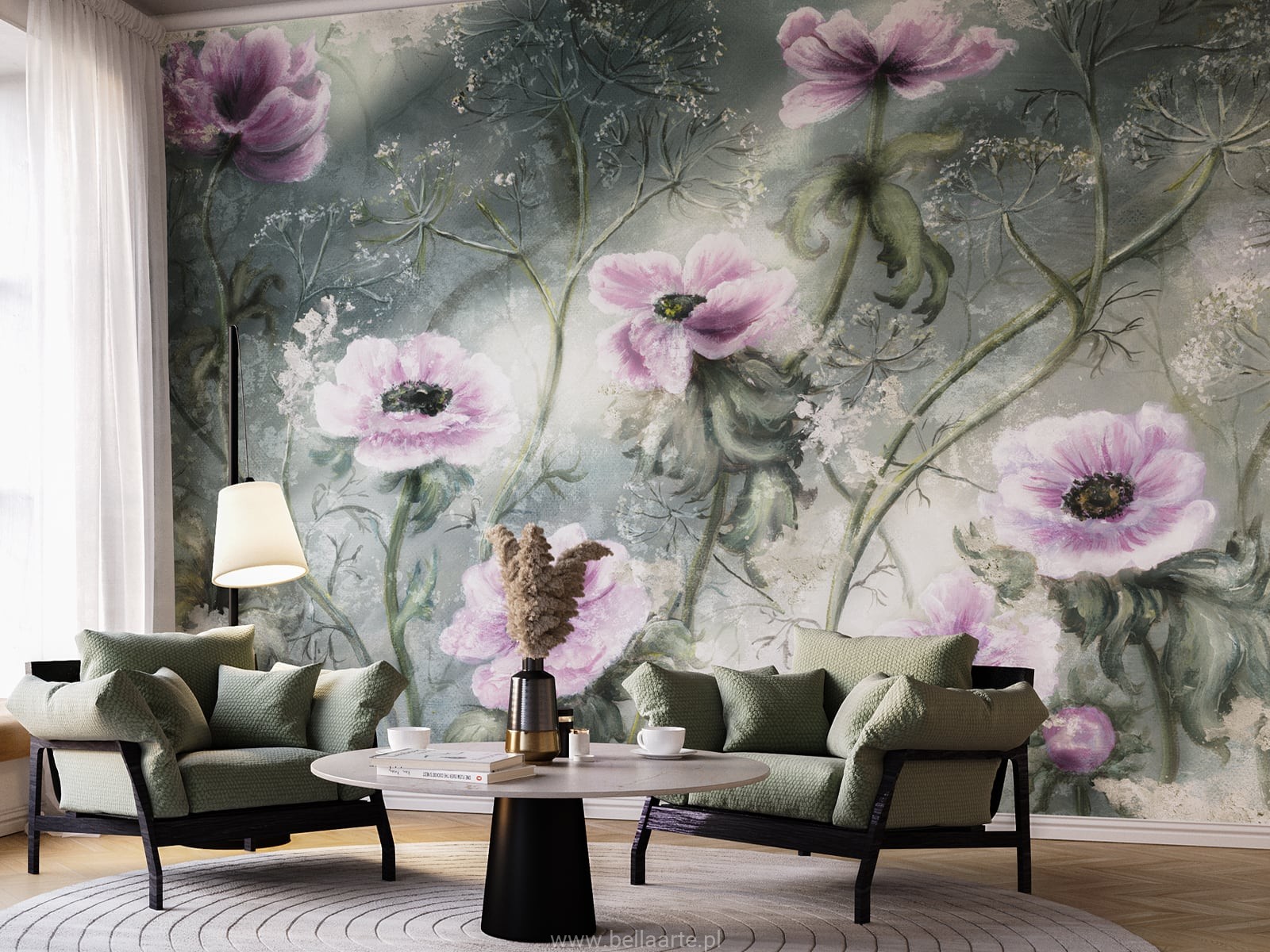Tapeta Flori to romantyczna kompozycja anemonów w odcieniach fioletu, które w połączeniu z zielonym tłem tworzą harmonijną i stylową dekorację ścian. Delikatny, a jednocześnie wyrazisty wzór sprawdzi się zarówno jako główny element aranżacji, jak i subtelny akcent wnętrza. Doskonały wybór do salonu, sypialni czy biura, gdzie wniesie odrobinę natury i elegancji.