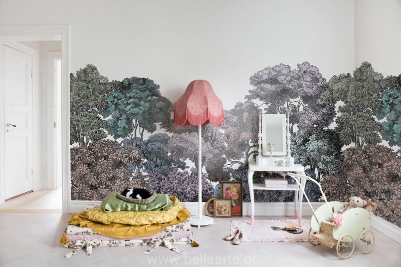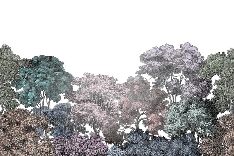 Kuszący, lekko mistyczny las w kolorach tęczy. Fototapeta sprzedawana na wymiar ściany. Cena dotyczy metra kwadratowego fototapety.