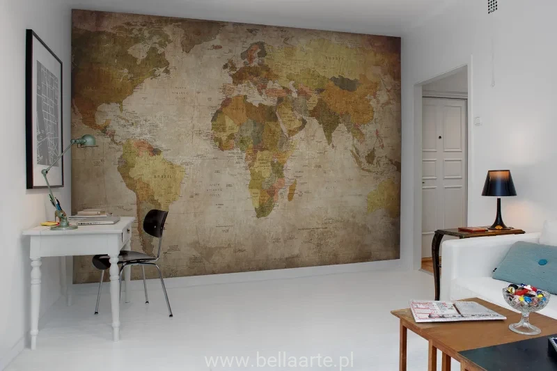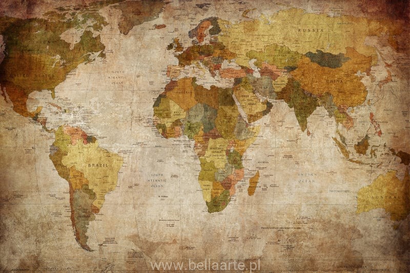 Mapa świata w postaci fototapety na ścianę. Fototapeta sprzedawana na wymiar ściany. Cena dotyczy metra kwadratowego fototapety.