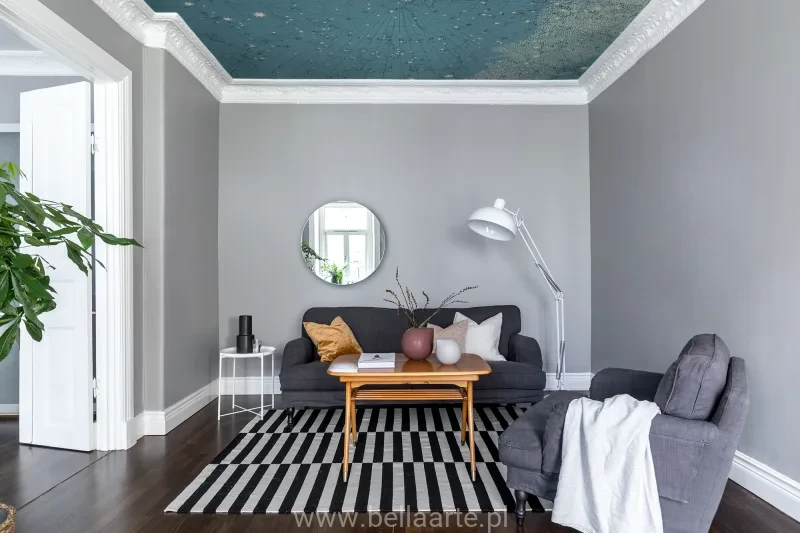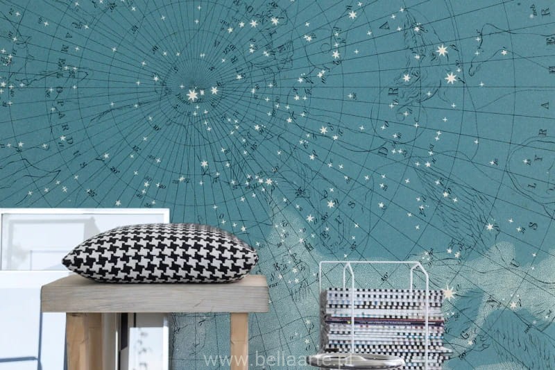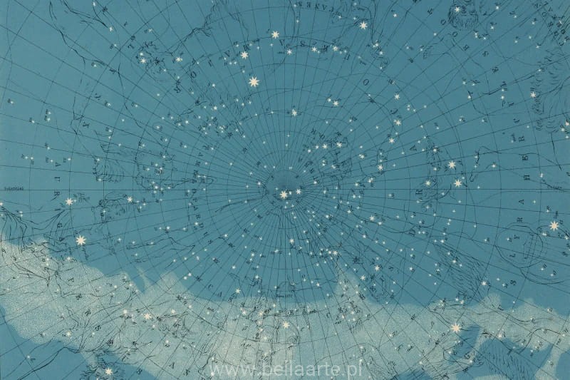 Niesamowita ilustracja północnej półkuli z gwiezdną mapą. Ilustrowana konstelacja spoczywa na niewyobrażalnie pięknym, niebieskim stonowanym tle. Fototapeta sprzedawana na wymiar ściany. Cena dotyczy metra kwadratowego fototapety.