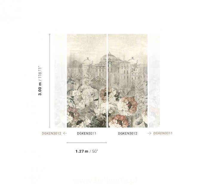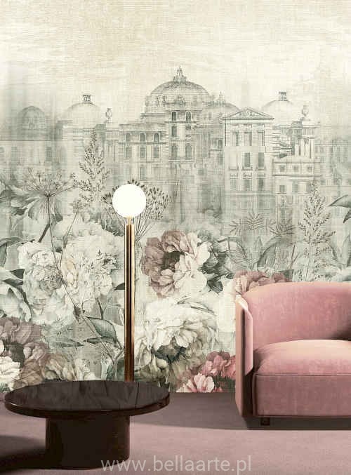 Mural Casteleview Rose i Mist przedstawia pałac. Dostępne są dwie odsłony tej tapety. W pierwszej na pierwszym planie widać kwiaty, druga natomiast to lustrzane odbicie pałacu w wodzie. Fototapeta ta dostępna jest w dwóch wersjach kolorystycznych. Mural składa się z dwóch części, które można ze sobą połączyć lub ułożyć na ścianie pojedynczo.