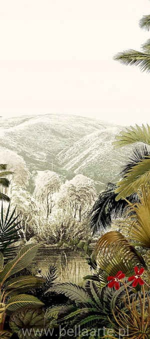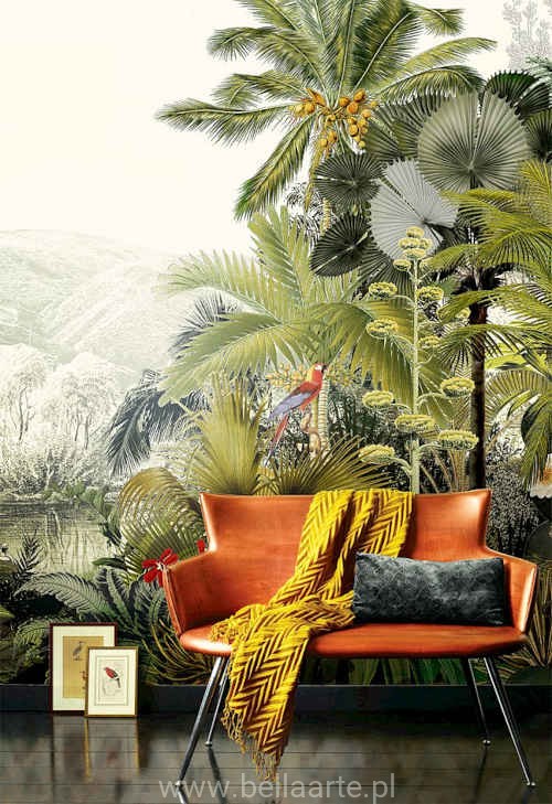 Mural Oazis to egzotyczny panel przedstawiający palmy, egzotyczne drzewa, jak i egzotyczne zwierzęta małpy, papugi. Wzór ten stanowi jeden z trzech elementów całego muralu, który można uzupełnić o dodatkowe panele lub potraktować jako soltier na ścianie.