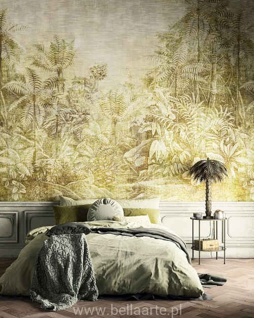 Mural Wander Linien i Wander Leaf to fototapety ukazujące dżunglę i jej egzotyczną, bujną roślinność. Murale dostępne są w dwóch wersjach kolorystycznych, w delikatnych jakby zamglonych barwach.Fototapeta wyprodukowana jest z domieszką naturalnych włókien sizalu, dlatego jej struktura jest bardzo dekoracyjna. Mural składa się z czterech części, które można ze sobą połączyć lub ułożyć na ścianie pojedynczo.