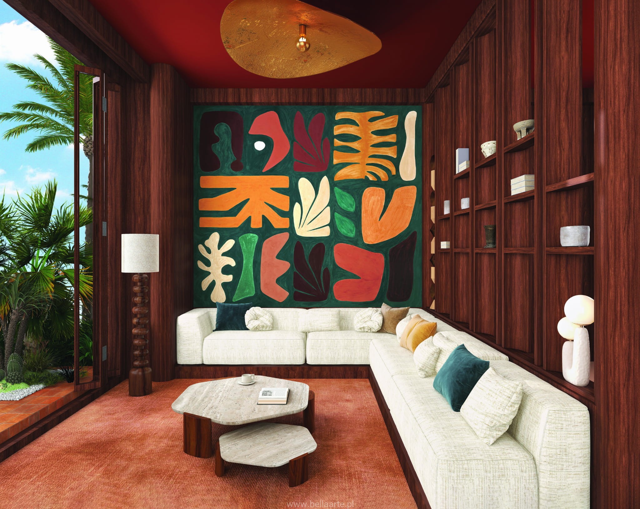 Ten szeroki panel ścienny otwiera przestrzeń na dynamiczną grę form i kolorów. Każdy detal został starannie zaprojektowany, a zastosowanie różnorodnych faktur dodaje głębi i wyrazistości.