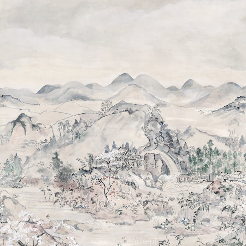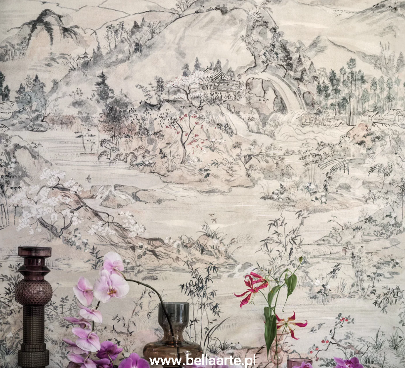 Japońska Chinoiserie to zapierający dech w piersiach projekt, który łączy kilka scenerii inspirowanych najpiękniejszymi ogrodami Japonii. Pociągnięcia kaligrafii prowadzą przez malowniczy krajobraz pełen wzgórz, drzew, kwiatów oraz płynącej wody, tworząc atmosferę spokoju i harmonii. Kwiaty drzewa Sakura rozkwitają poetycko w naturalnym otoczeniu, a całość prezentuje się zarówno na tradycyjnych bazach w sześciu wersjach kolorystycznych, jak i na naturalnym płótnie trawiastym. Wzór, inspirowany japońską tradycją i sztuką, łączy starożytne materiały z nowoczesnym podejściem, nadając przestrzeni ponadczasowy i elegancki charakter.