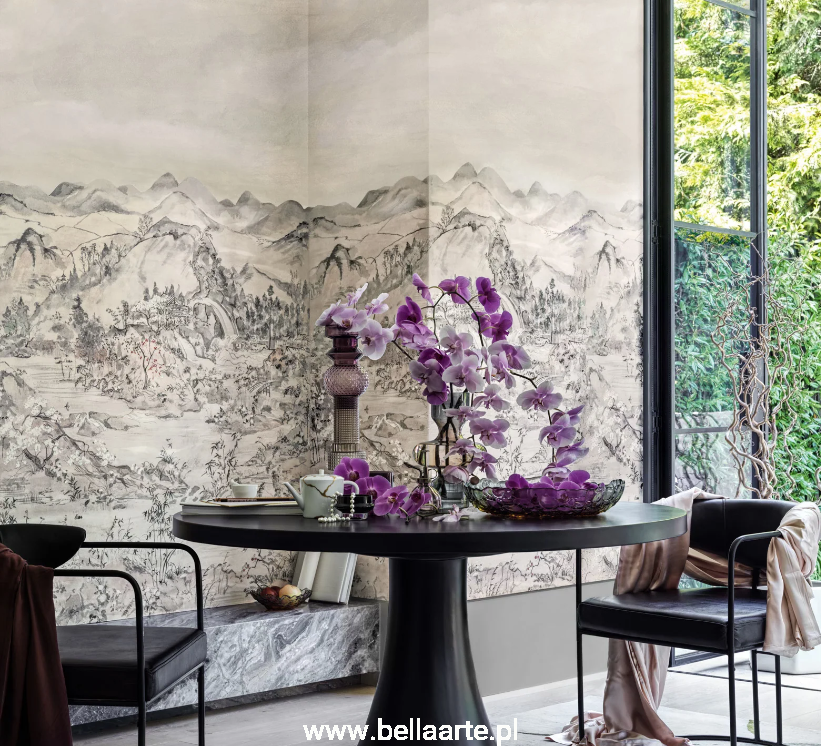 Japońska Chinoiserie to zapierający dech w piersiach projekt, który łączy kilka scenerii inspirowanych najpiękniejszymi ogrodami Japonii. Pociągnięcia kaligrafii prowadzą przez malowniczy krajobraz pełen wzgórz, drzew, kwiatów oraz płynącej wody, tworząc atmosferę spokoju i harmonii. Kwiaty drzewa Sakura rozkwitają poetycko w naturalnym otoczeniu, a całość prezentuje się zarówno na tradycyjnych bazach w sześciu wersjach kolorystycznych, jak i na naturalnym płótnie trawiastym. Wzór, inspirowany japońską tradycją i sztuką, łączy starożytne materiały z nowoczesnym podejściem, nadając przestrzeni ponadczasowy i elegancki charakter.
