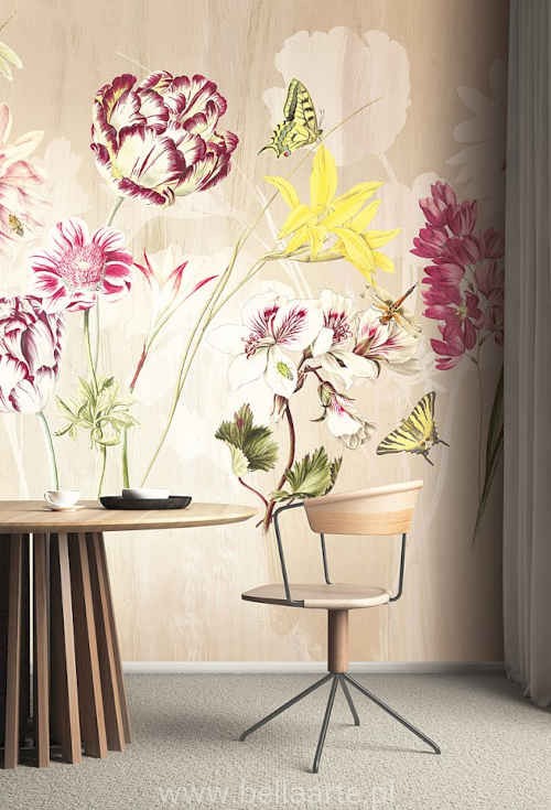 Mural Elise Blush to mural w delikatne kwiaty powiewające na łące. Elise przywołuje sielski, słoneczny, podmiejski ciepły klimat. Wzór ten stanowi jeden z elementów całego muralu, który można uzupełnić o dodatkowe panele lub potraktować jako soltier na ścianie.