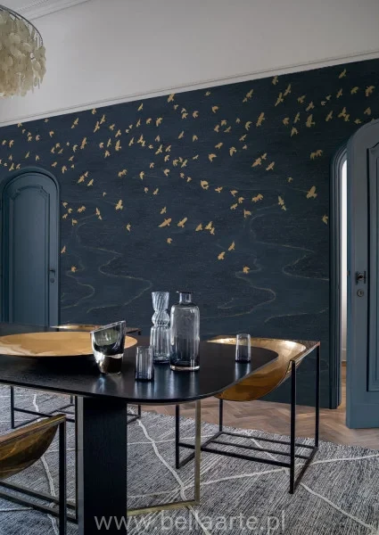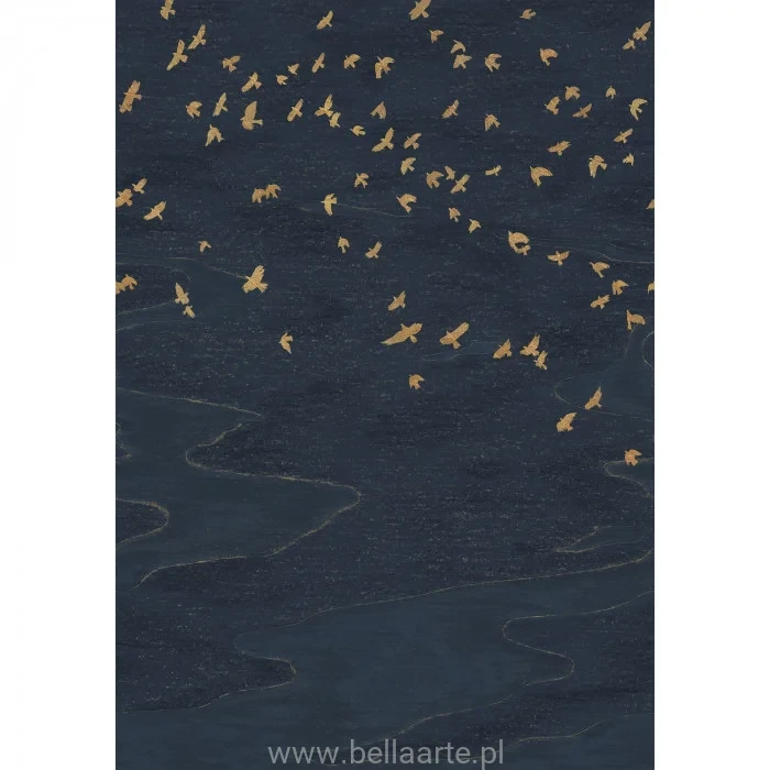 Mural lecące ptaki to niezwykła tapeta inspirowana coroczną wędrówką ptaków, które przemierzają tysiące mil, podążając niewidzialnymi szlakami na tle nieba. Ich trasy, wyryte jakby w granacie nocnego nieba lub złocie zmierzchu, przenoszą nas w świat marzeń i wolności. Na złotej podstawie rozciąga się pejzaż, w którym delikatność jasnego nieba spotyka się z głębią błękitu – to właśnie tam wędrują ptaki, tworząc harmonijną kompozycję natury i ruchu.