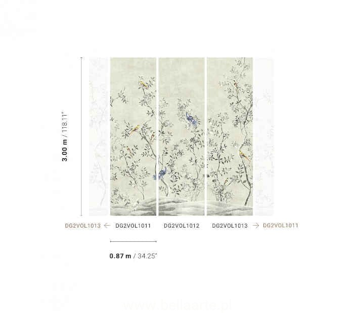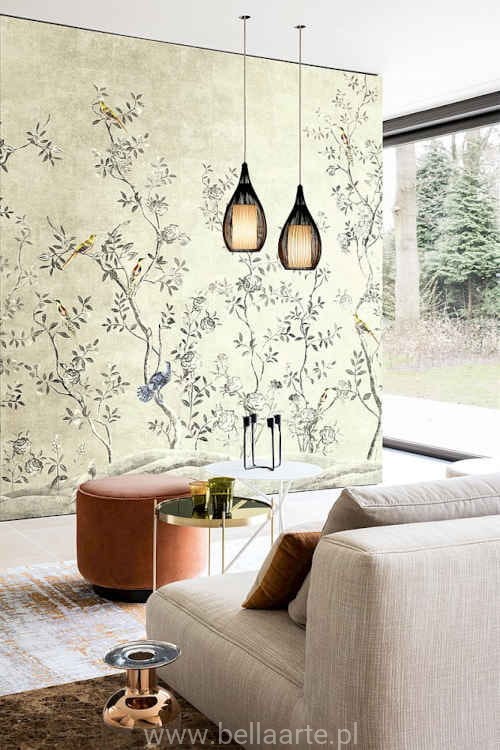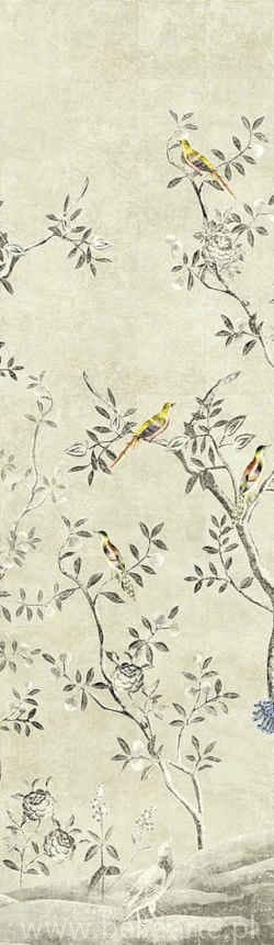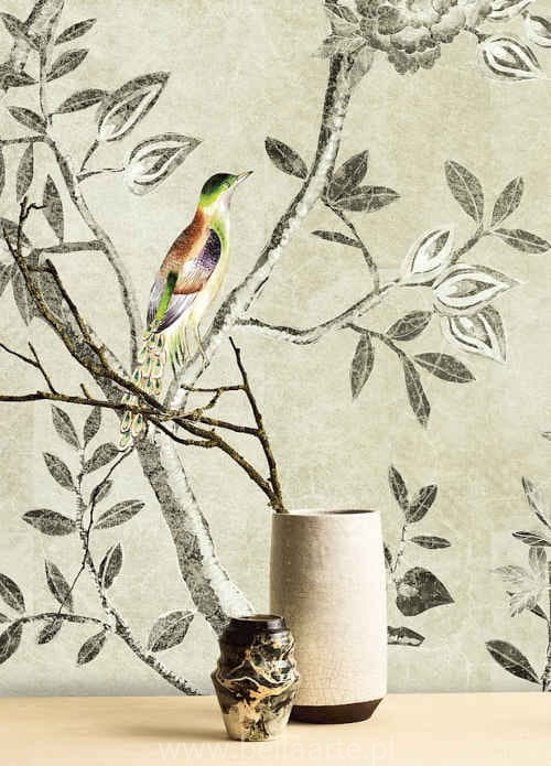 Mural Voliere Paloma to subtelna fototapeta w delikatne listki i ptaszki siedzące na gałązkach. Fototapeta wyprodukowana jest z domieszką naturalnych włókien sizalu, dlatego jej struktura jest bardzo dekorcacyjna. Mural składa się z dwóch części, które można ze sobą połączyć lub ułożyć na ścianie pojedynczo.