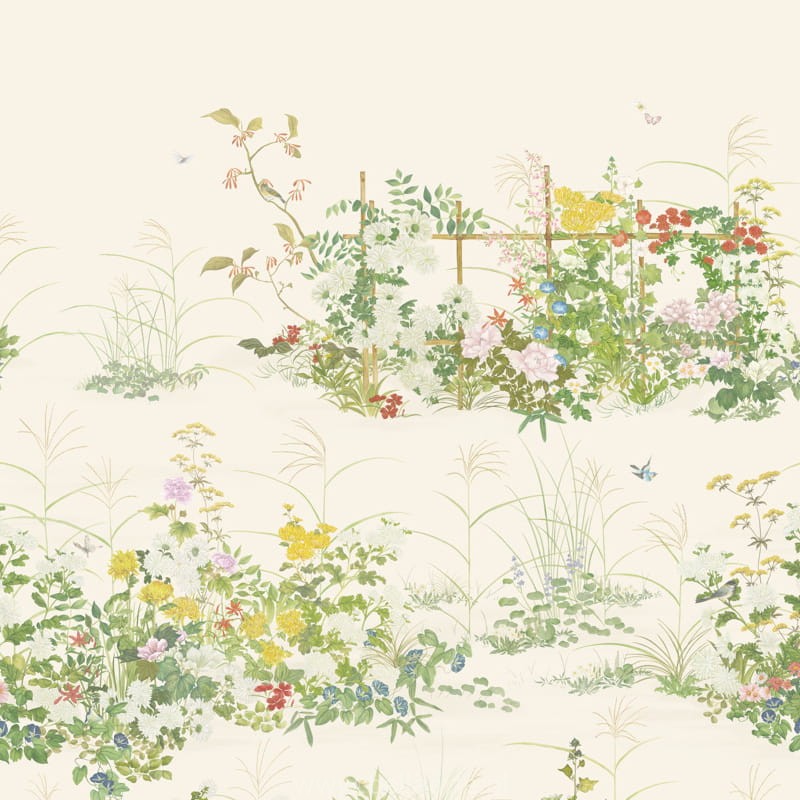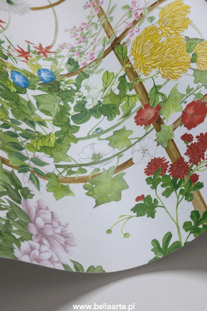 Scenic Flora to wyjątkowy wzór inspirowany haftowanymi kimonami w stylu vintage oraz tradycyjnymi japońskimi chinoiseriami z XVII wieku. Jego teatralna struktura pozwala na wielowarstwowe interpretacje, ukazując elegancki krajobraz japońskich kwiatów. Wzór przedstawia romantyczną historię miłosną, w której Kiku, mijając pole polnych kwiatów, codziennie obdarowywał swoją ukochaną Sakurę kwiatem. Kiku i Sakura, nazwani na cześć kwiatów Japonii, stają się bohaterami tej pełnej emocji opowieści. Kwitnące pole kwiatów w tle chinoiserie symbolizuje staranność i miłość, a malownicza Flora staje się klejnotem przestrzeni, wprowadzając subtelną elegancję i wieczną delikatność.