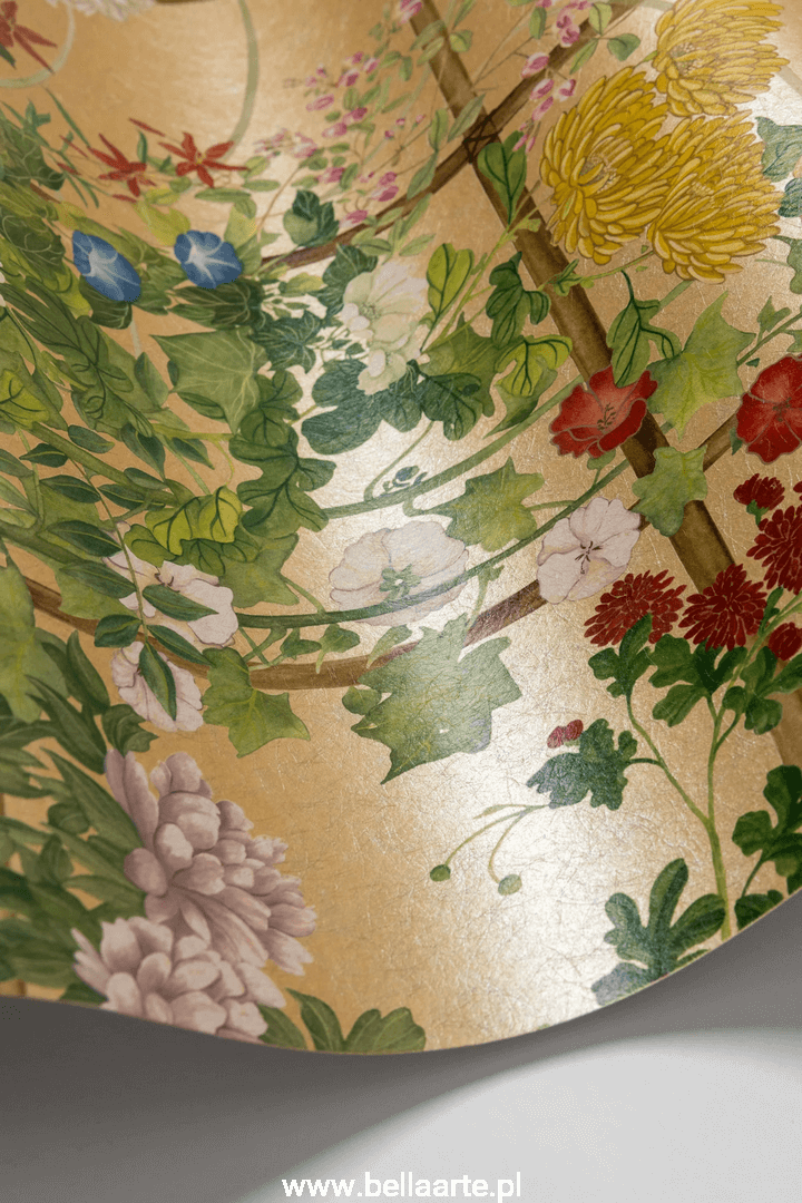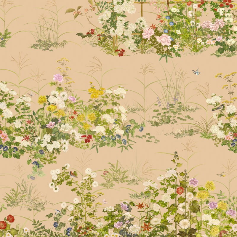 Scenic Flora to wyjątkowy wzór inspirowany haftowanymi kimonami w stylu vintage oraz tradycyjnymi japońskimi chinoiseriami z XVII wieku. Jego teatralna struktura pozwala na wielowarstwowe interpretacje, ukazując elegancki krajobraz japońskich kwiatów. Wzór przedstawia romantyczną historię miłosną, w której Kiku, mijając pole polnych kwiatów, codziennie obdarowywał swoją ukochaną Sakurę kwiatem. Kiku i Sakura, nazwani na cześć kwiatów Japonii, stają się bohaterami tej pełnej emocji opowieści. Kwitnące pole kwiatów w tle chinoiserie symbolizuje staranność i miłość, a malownicza Flora staje się klejnotem przestrzeni, wprowadzając subtelną elegancję i wieczną delikatność.