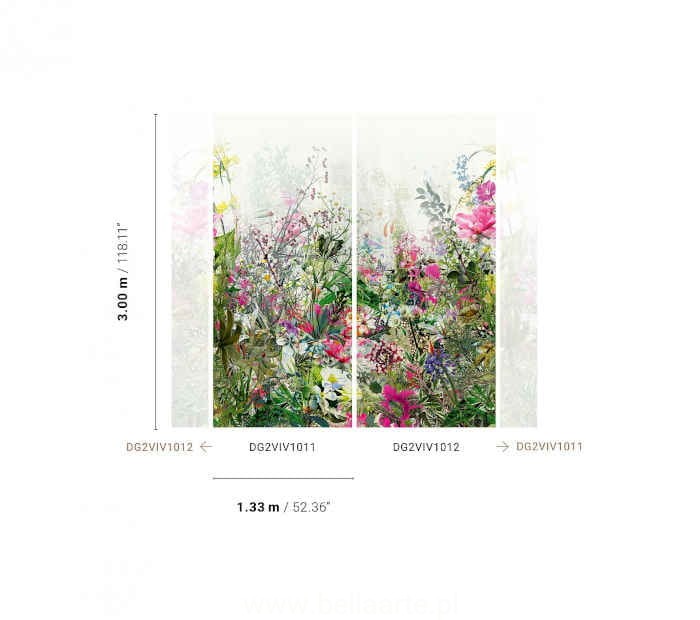 Mural Vived Floral to bardzo efektowna fototapeta przedstawiająca kwiaty na łące w bardzo żywych barwach. Mural składa się z dwóch części, które można ze sobą połączyć lub ułożyć na ścianie pojedynczo.