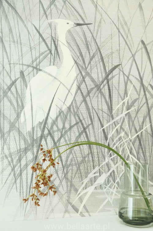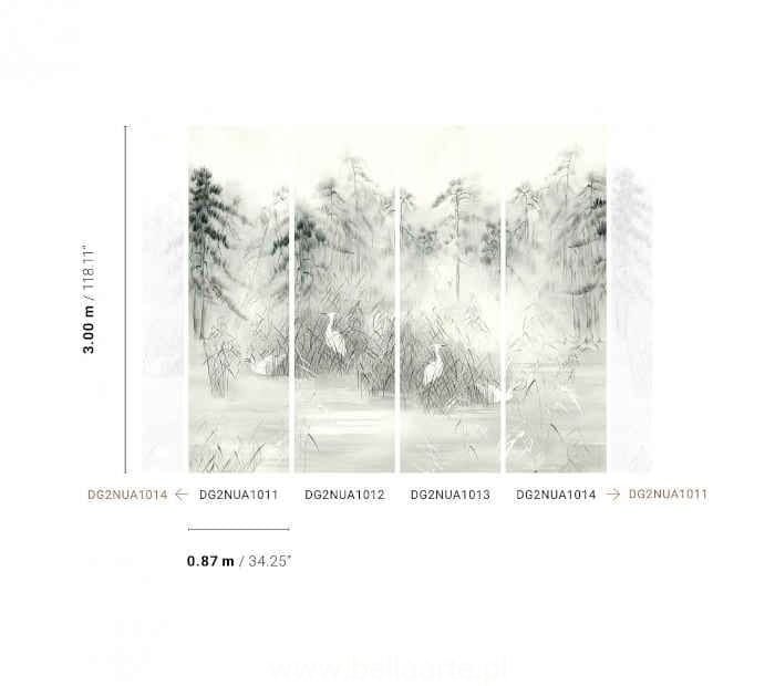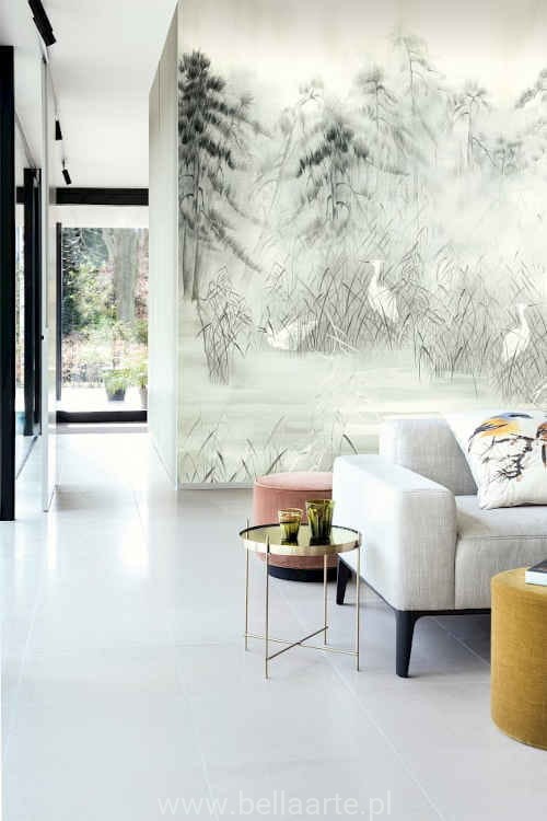 Mural Nuage Lake to przepiękna fototapeta przedstawiająca żurawie w wysokiej trawie na tle lasu. Mural w bardzo delikatnej barwie i ciekawej sizalowej strukturze. Mural składa się z czterech części, które można ze sobą połączyć lub ułożyć na ścianie pojedynczo.