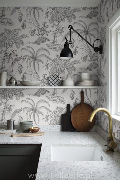 Ten rodzaj wzoru, jest najczęściej spotykany w klasycznych domach. Ale równie pięknie pasuje do pokoju dziecięcego lub salonu w nowoczesnym domu. Egzotycznym małpom kołyszącym się między palmami towarzyszą żółwie, pawie i piękne kwiaty. Wspaniały wyimaginowany świat, nazwany na cześć małego Moa, który wciąż był w łonie, kiedy jego matka rysowała wzór.