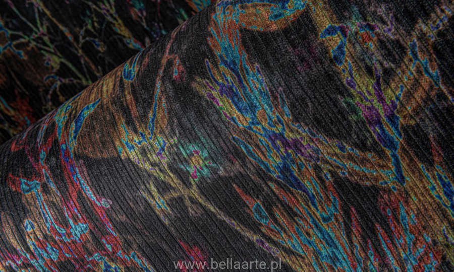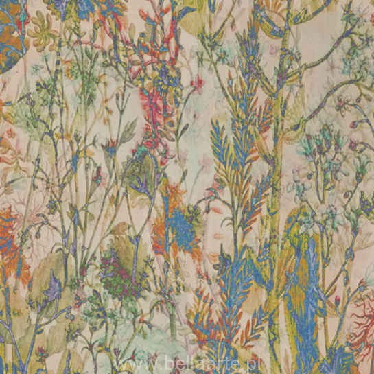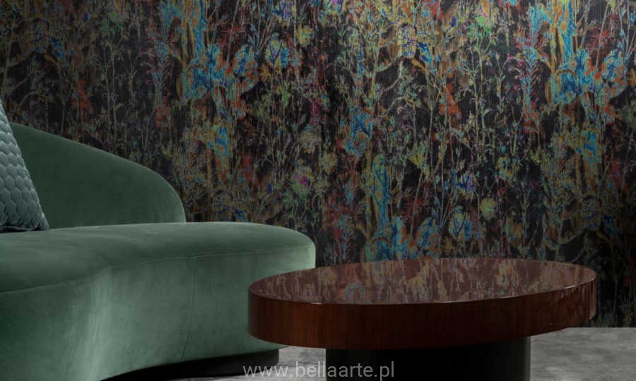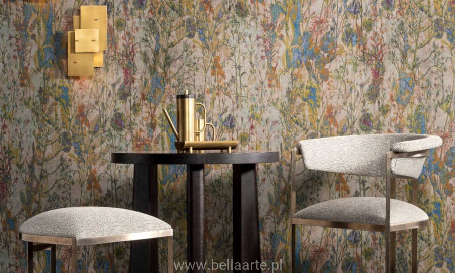 Ten botaniczny obraz przedstawia przestrzeń z kolorowymi bukietami. Wyróżniający się design ma z jednej strony bardzo luksusowy wygląd, az drugiej strony spontaniczny i zabawny charakter. Wyraziste połączenie kolorów, miękki prążkowany aksamit i niepoważne wzornictwo charakteryzują wzór Wildflower.