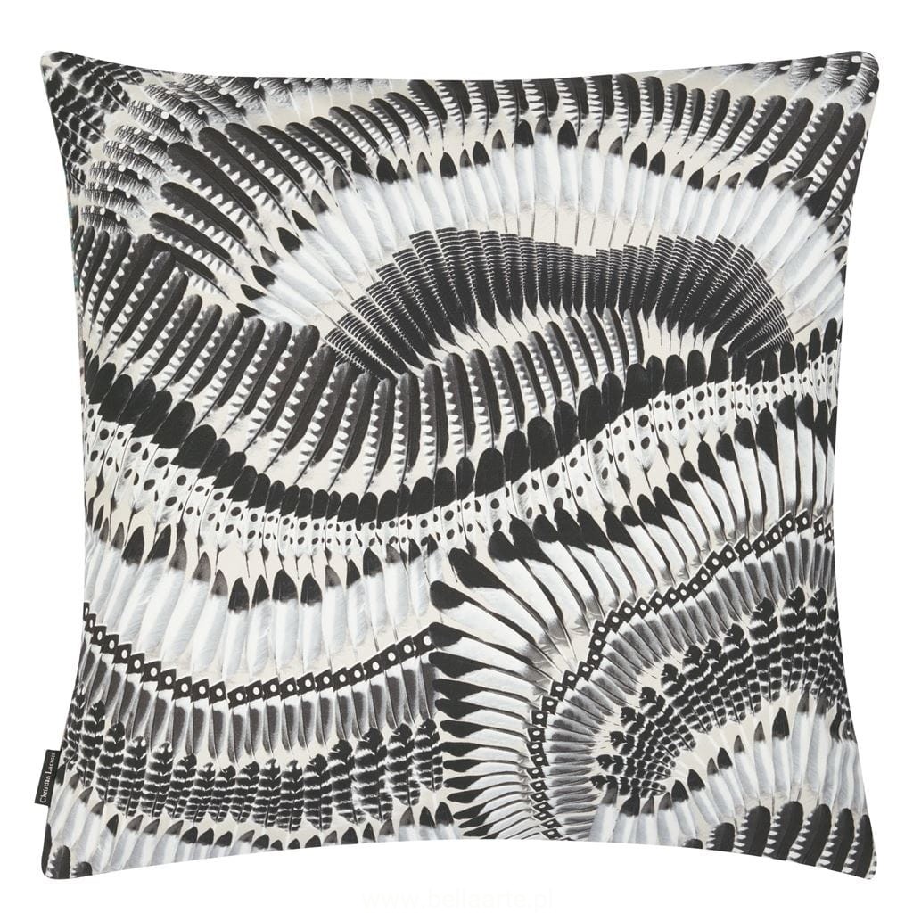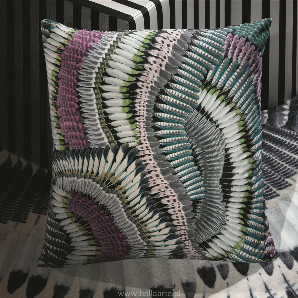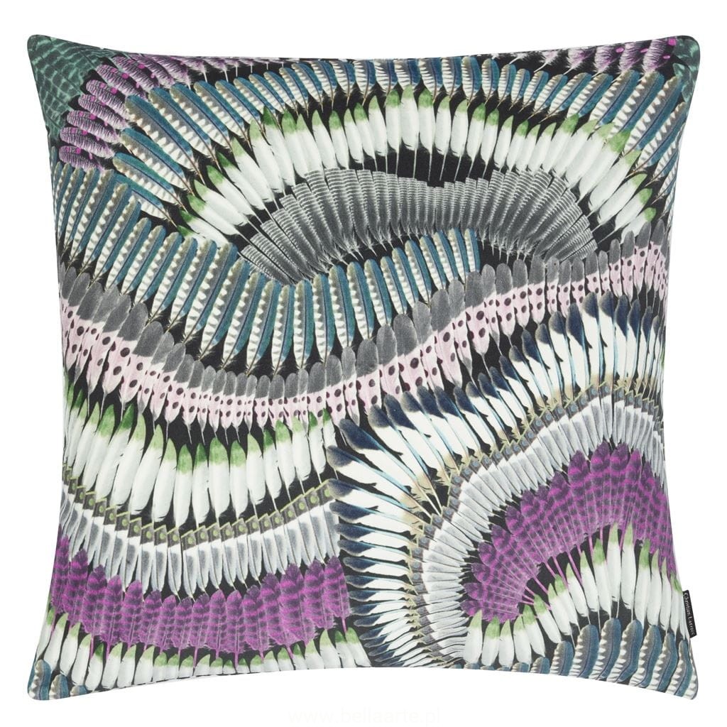 W tej efektownej poduszce dekoracyjnej Maison Christian Lacroix zwraca uwagę wyjątkowo szczegółowe zawijasy piór. Drukowany cyfrowo na