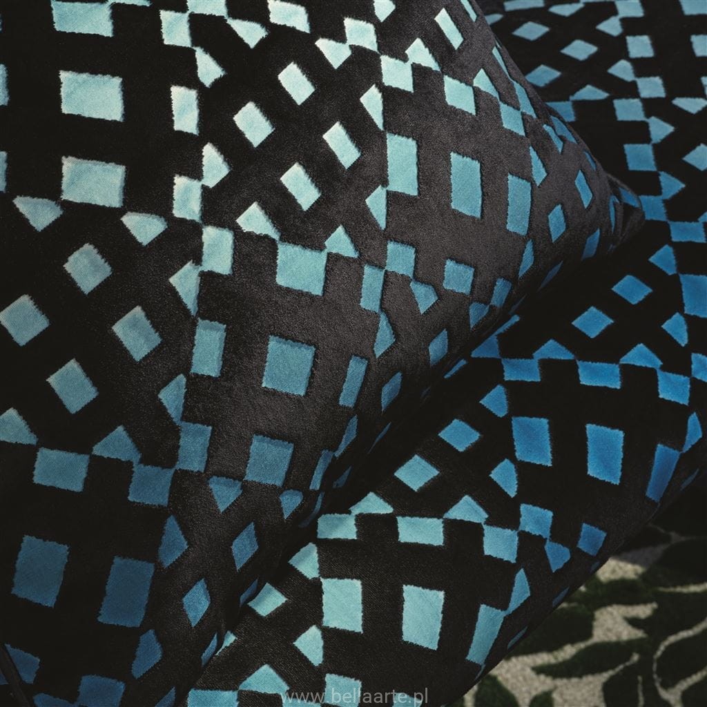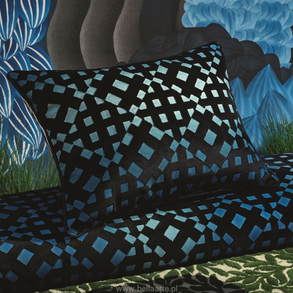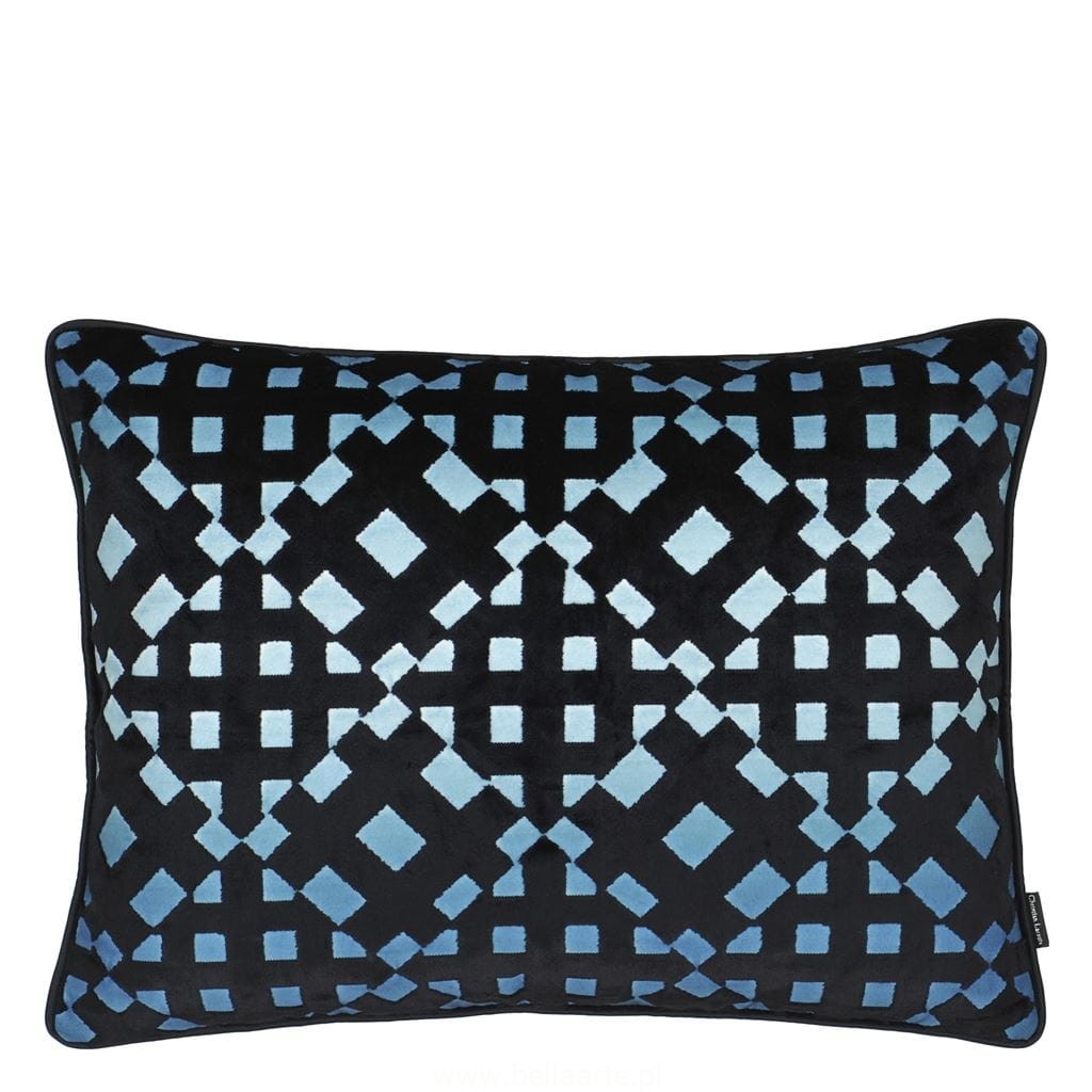 Luksusowa, aksamitna poduszka dekoracyjna od Maison Christian Lacroix z graficznym wzorem w kratę. Bogate czarne aksamitne runo jest umieszczone