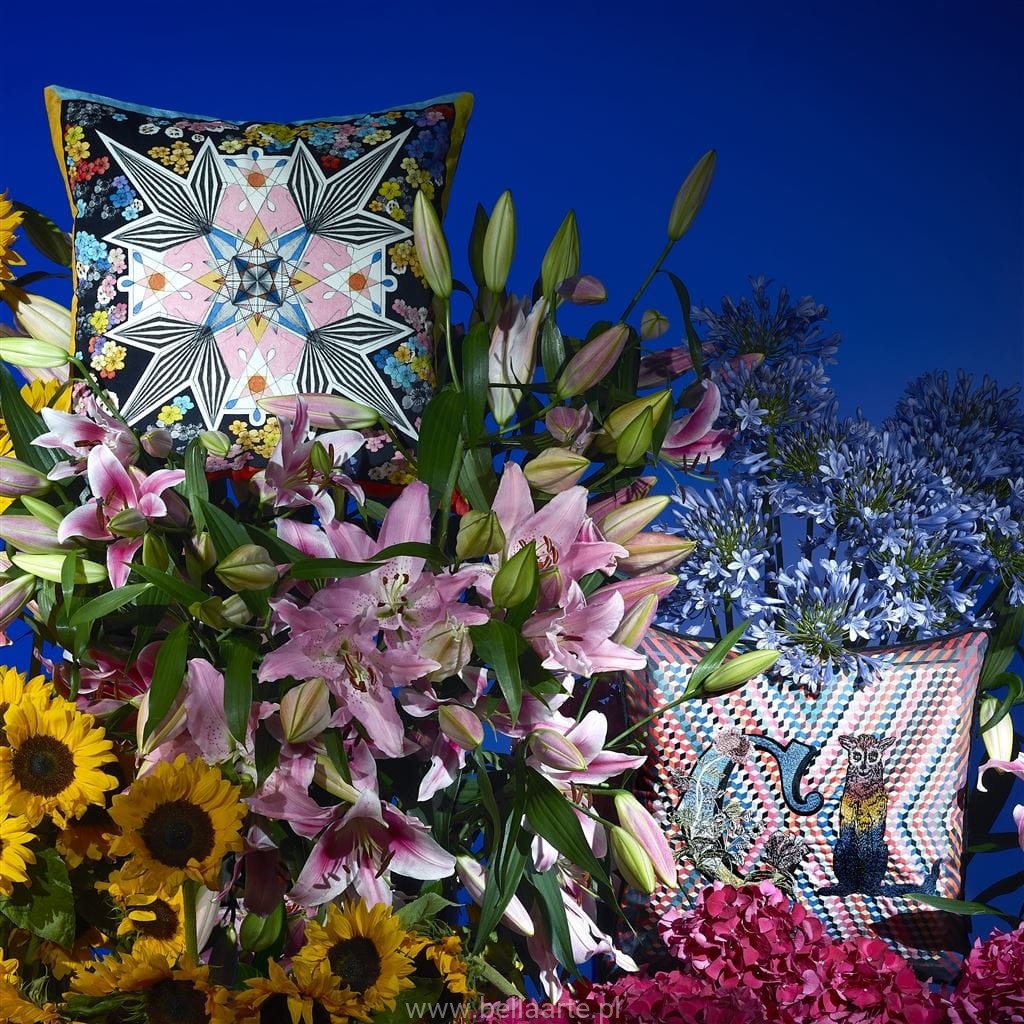 połączonym z małymi wielobarwnymi kwiatami. Ta designerska poduszka dekoracyjna jest drukowana cyfrowo na luksusowymaksamicie odwróconym