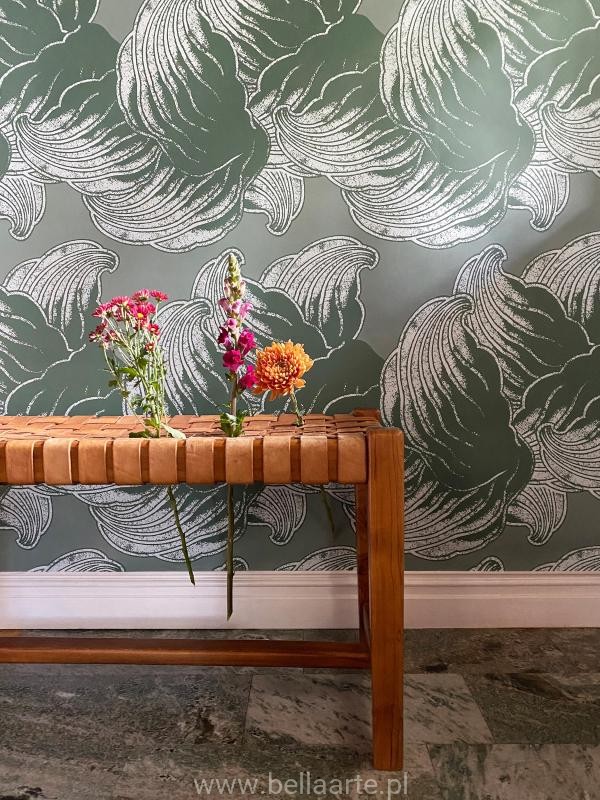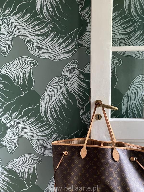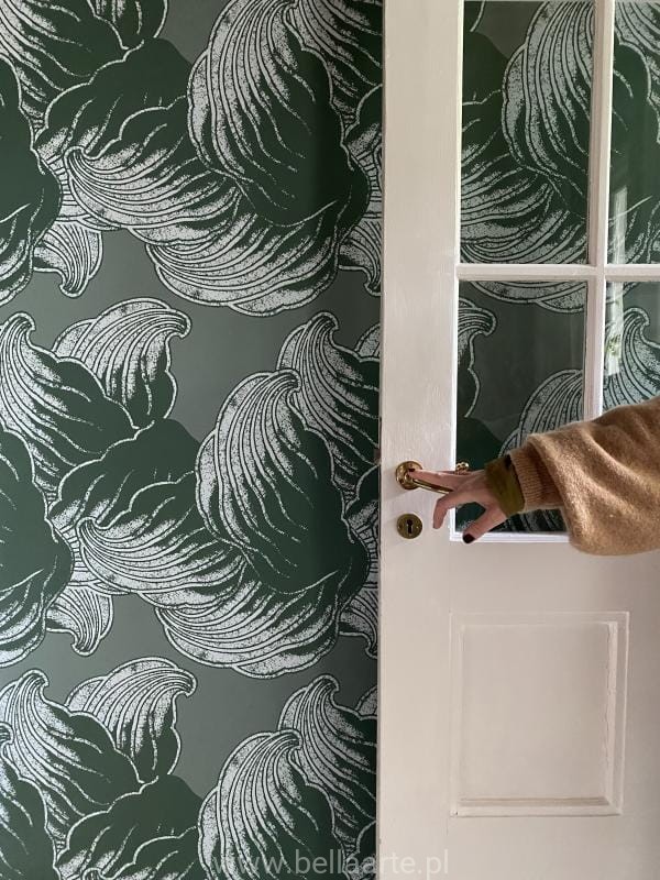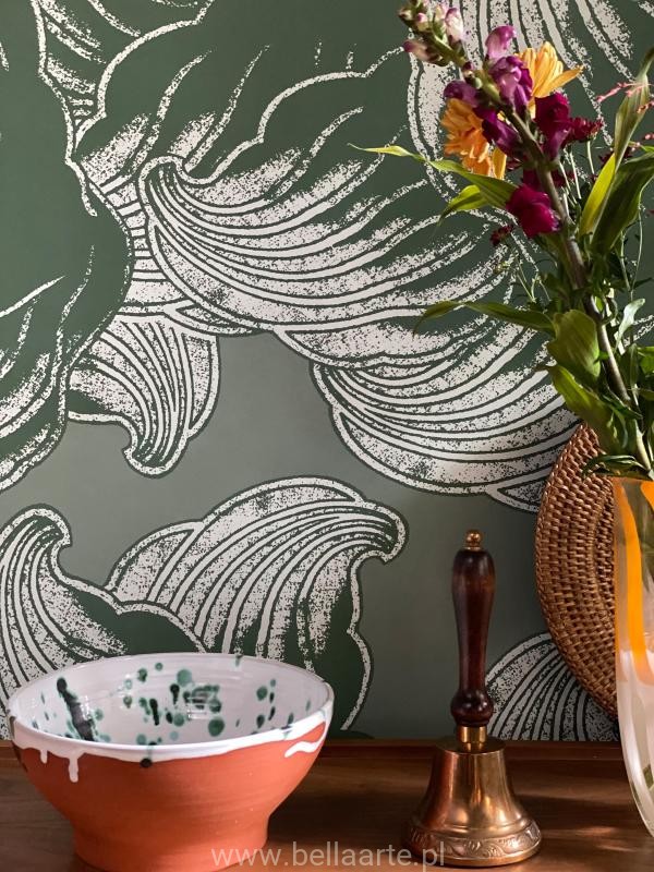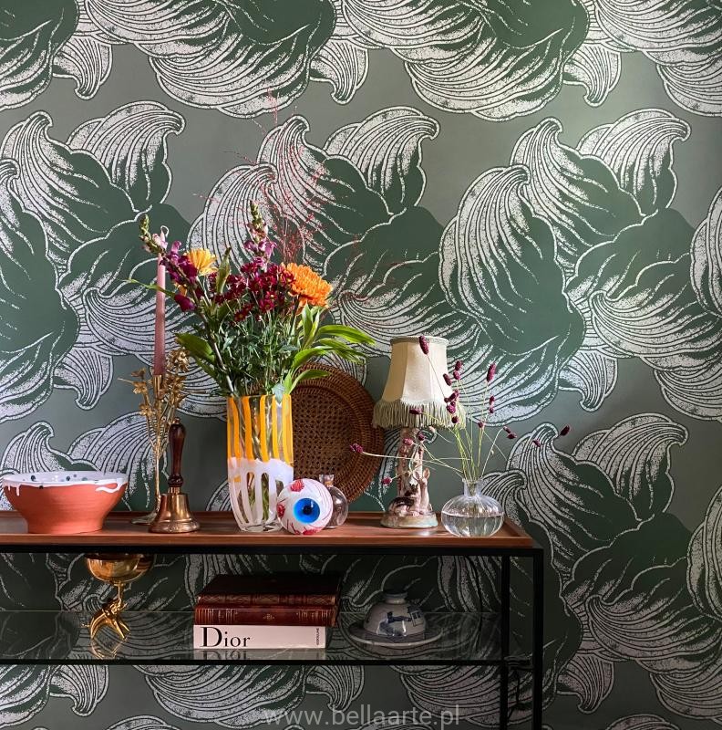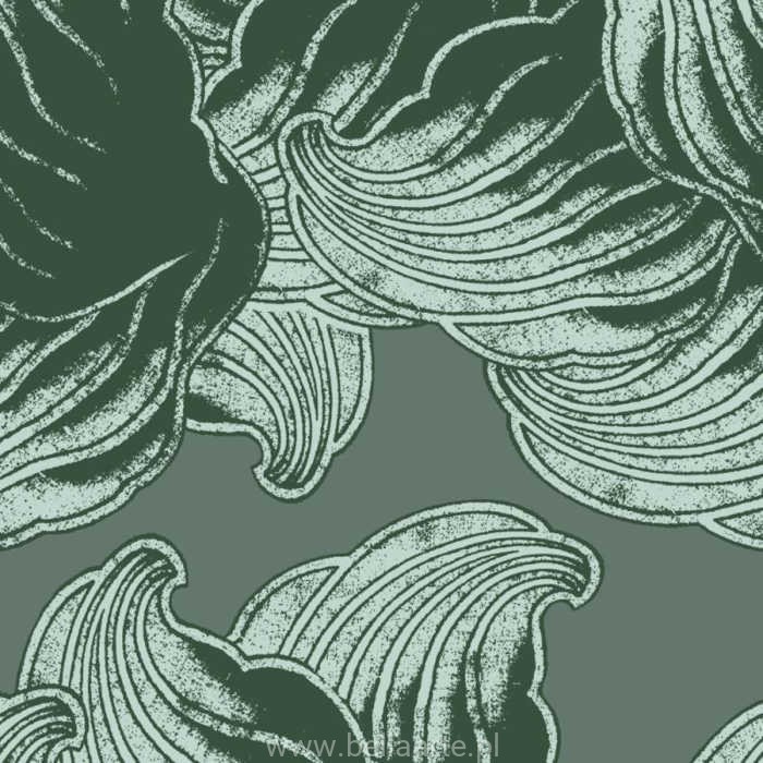Katalog Studio Lisa Bengtsson, a w nim wzór Balance ma duże zakrzywione liście, zachodzące na siebie. Wyrazisty wzór daje wrażenie harmonii i stanowi wyrazisty akcent w pomieszczeniu.