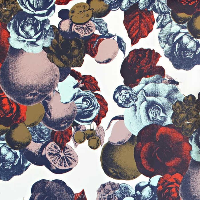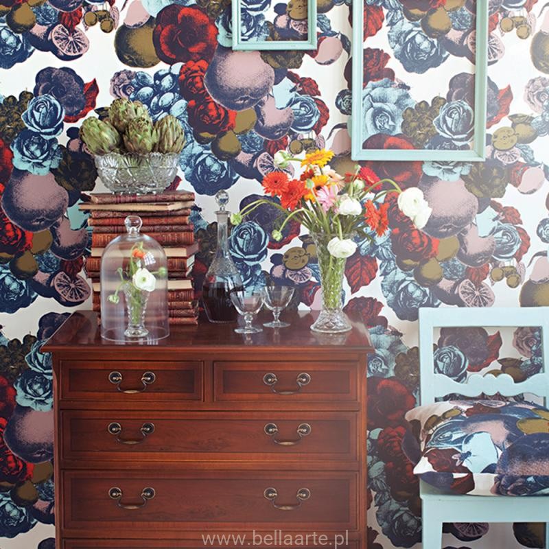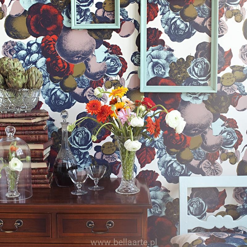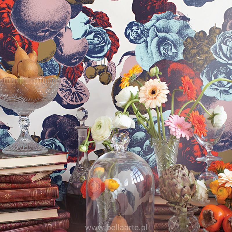 Katalog Studio Lisa Bengtsson, a w nim wzór Boudoir to tapeta z białego papieru z niebieskimi, czerwonymi i różowymi kwiatami oraz owocami.