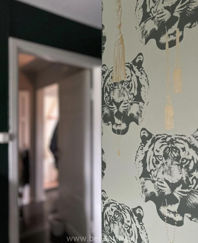 Katalog Studio Lisa Bengtsson, a w nim wzór Coco Tiger to łatwa w utrzymaniu tapeta z motywem graficznych tygrysów. Wzór bardzo odważny,wyrazisty i egzotyczny. Wielkoformatowa głowa tygrysa i frędzle są symetrycznie rozmieszczone na ścianie i tworzą artystyczny motyw vintage.