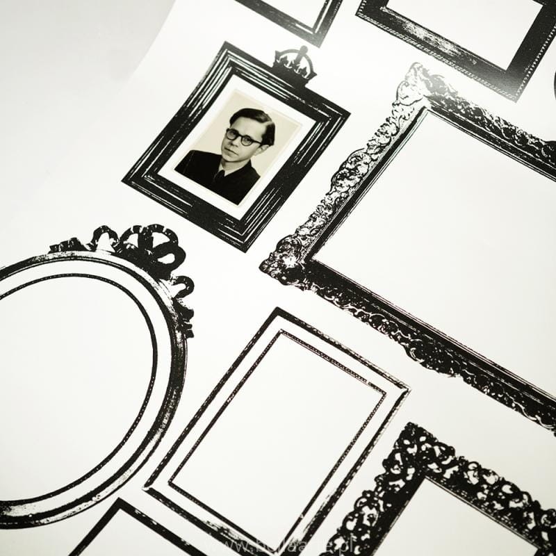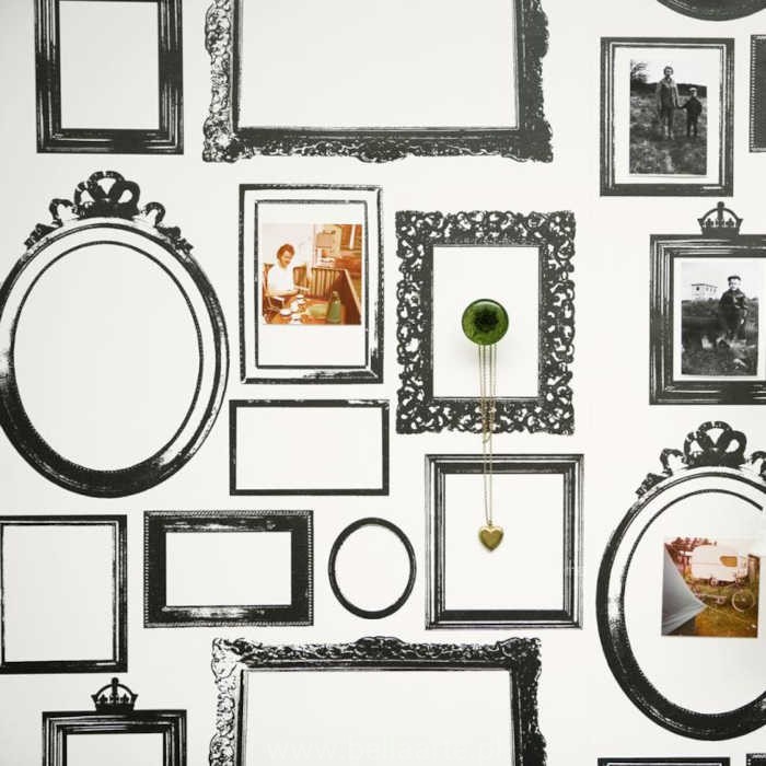 Katalog Studio Lisa Bengtsson, a w nim wzór Familjen to biała, prosta tapeta z graficznymi ciemnoszarymi ramkami jako motywem.