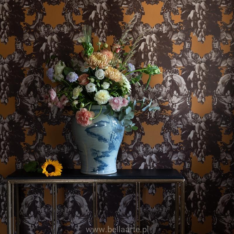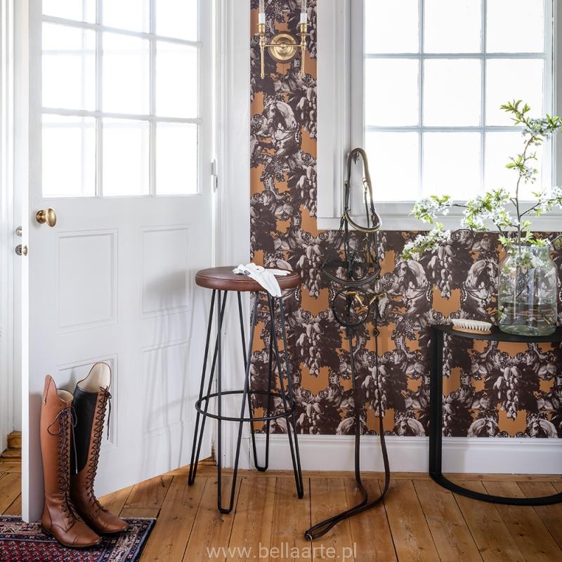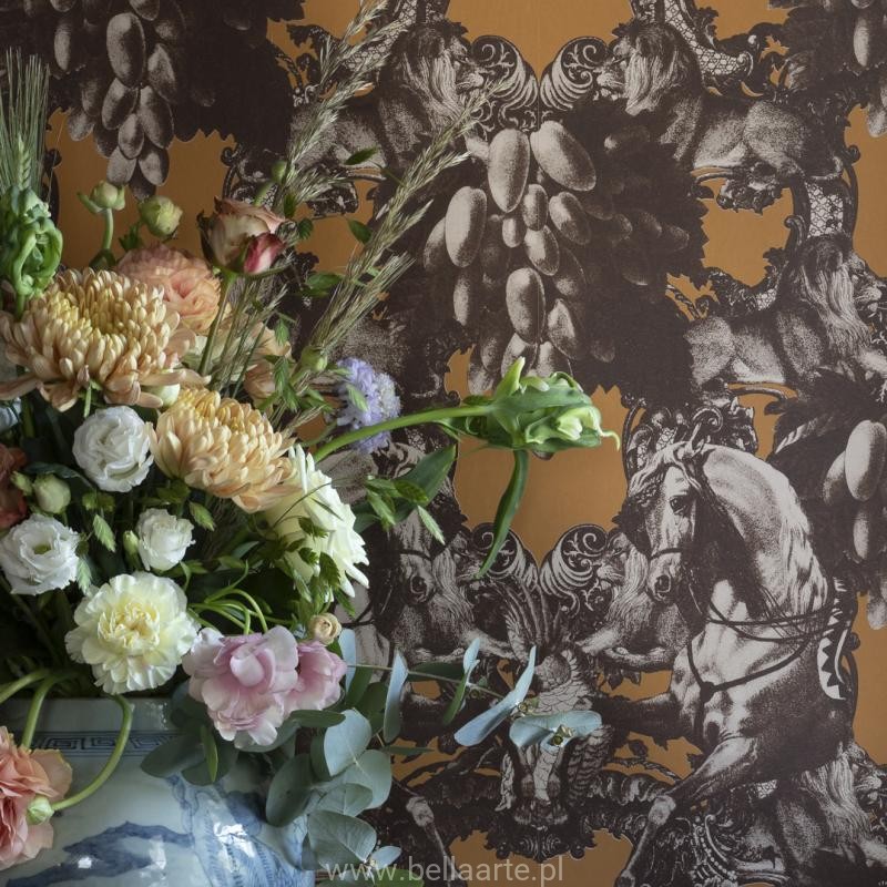 Katalog Studio Lisa Bengtsson, a w nim wzór Sir Grace tapeta z motywem koni. Sir Grace to jest coś wyjątkowego. Zainspirowany nowym rozdziałem w życiu, przeprowadzką, staruszkiem w niebieskim Volvo i erą narodowego romantyzmu. Projektantka stworzyła wzór, który nada twojemu domowi ciepło i luksus. "Wyobrażam sobie majestatyczną kobietę na koniu, gotową do bitwy. Lew daje jej siłę i moc, by kontynuować"