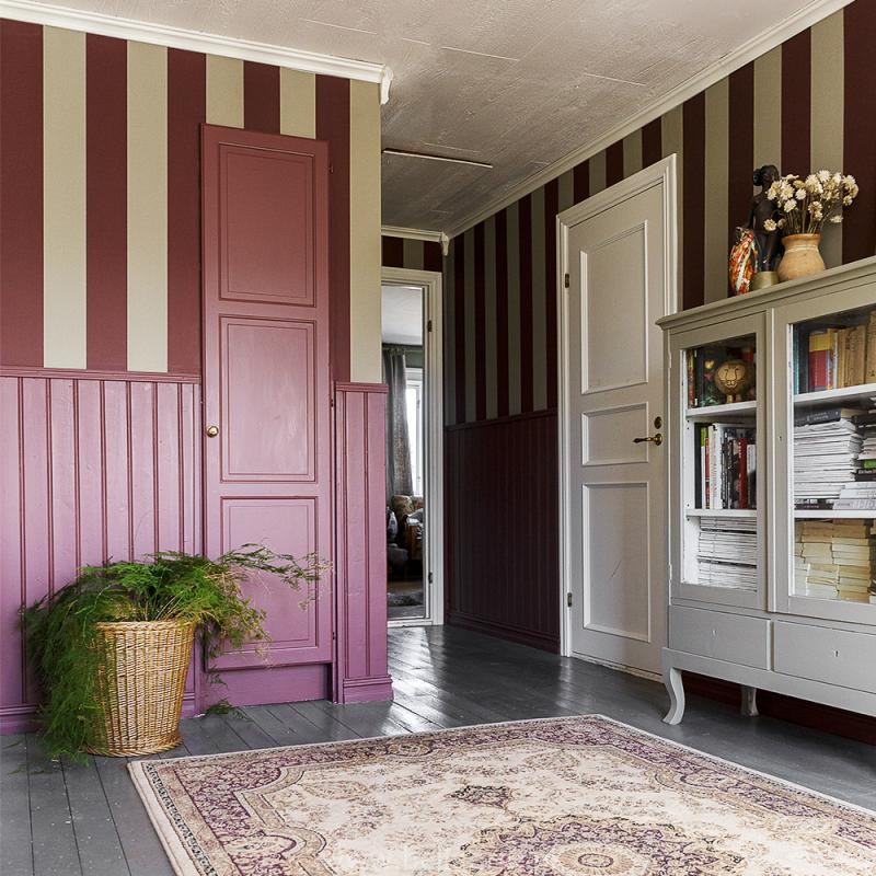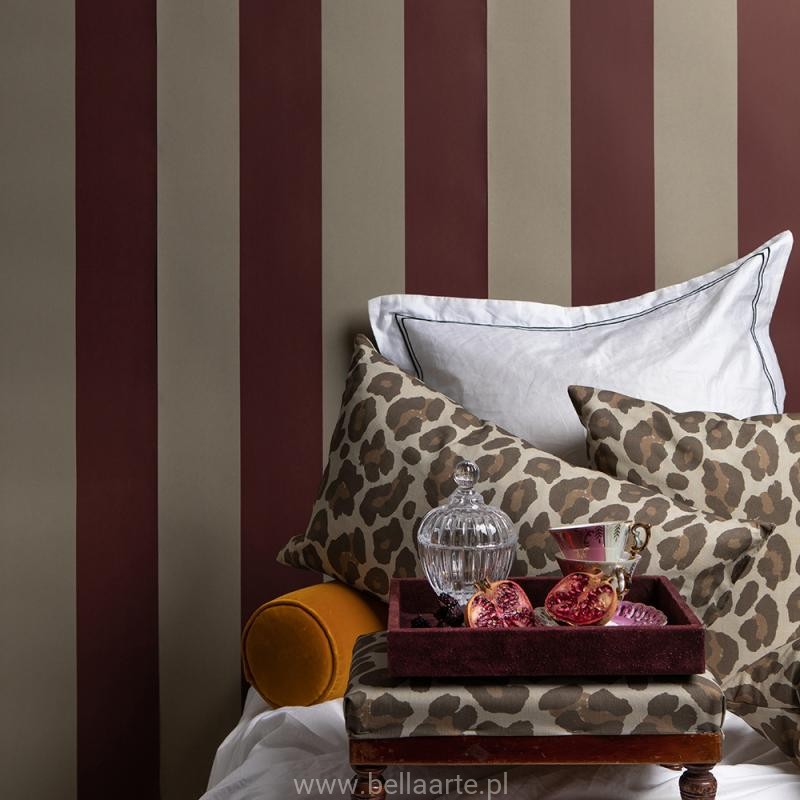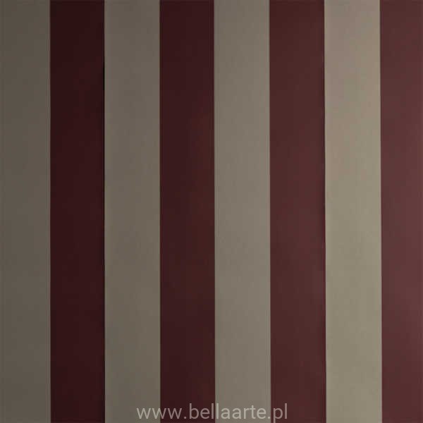 Katalog Studio Lisa Bengtsson, a w nim wzór Stripe Forward to klasyczna, prosta tapeta w paski w kolorach czerwieni i beżu.