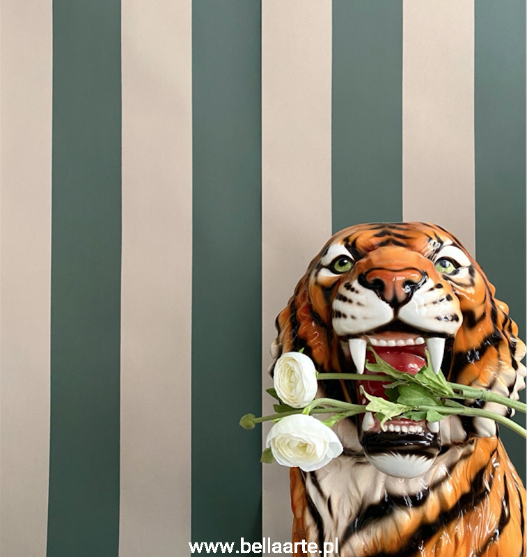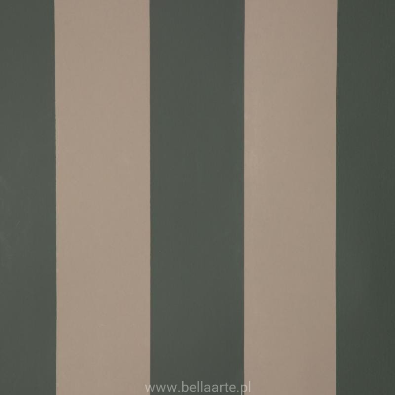 Katalog Studio Lisa Bengtsson, a w nim wzór Stripe Forward to klasyczna, prosta tapeta w paski w kolorach zieleni i beżu.