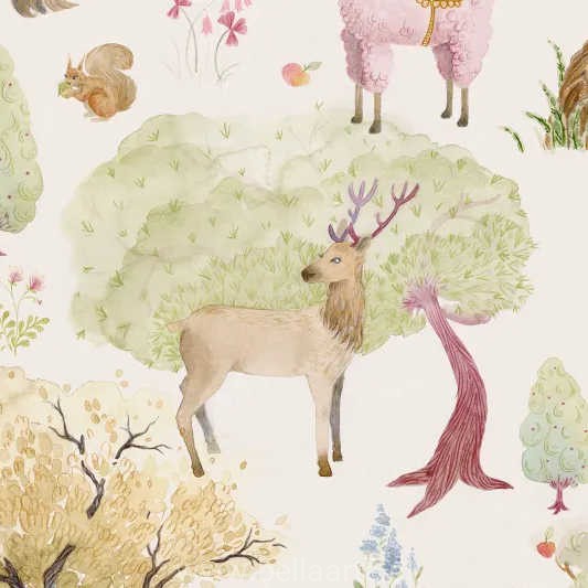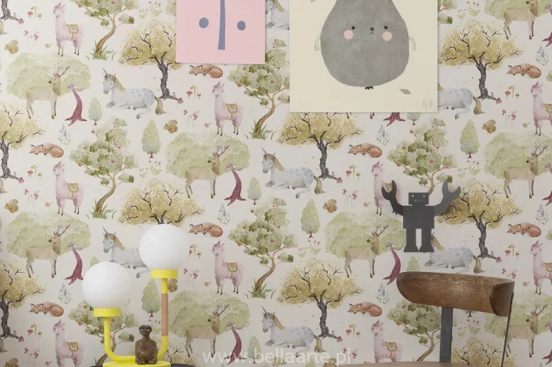 Tapeta przedstawia jednorożce, puszyste alpaki i drzemiące lisy.