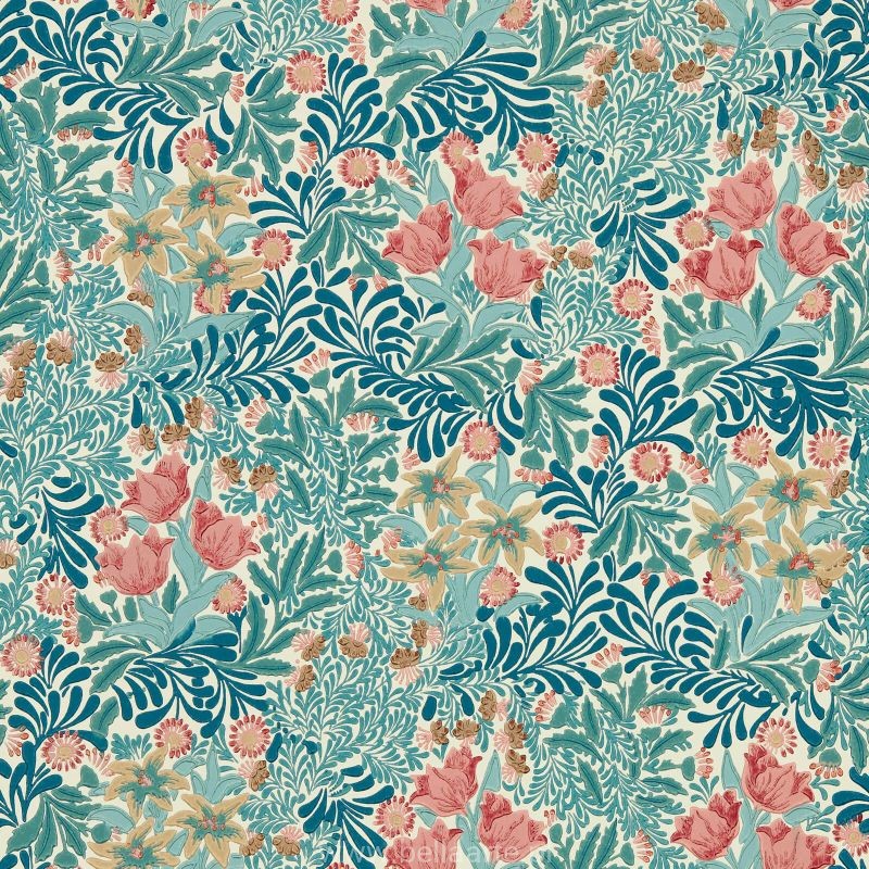 Tapeta łąka William Morris – Bower to wyjątkowy wzór inspirowany średniowiecznymi drzeworytami oraz niepowtarzalną estetyką XIX wieku. Projekt stworzony w 1877 roku przez Williama Morrisa zachwyca bogactwem detali i florystycznym rozmachem. Motyw bujnej leśnej łąki pełnej kwiatów wprowadza do wnętrz naturalną harmonię i subtelny urok angielskich ogrodów. Wersja kolorystyczna Bough’s Green/Rose najwierniej oddaje oryginalną wizję Morrisa, oferując ciepłe, klasyczne tonacje zieleni i różu. Dla miłośników chłodniejszych odcieni dostępne są warianty Indigo oraz Herball.