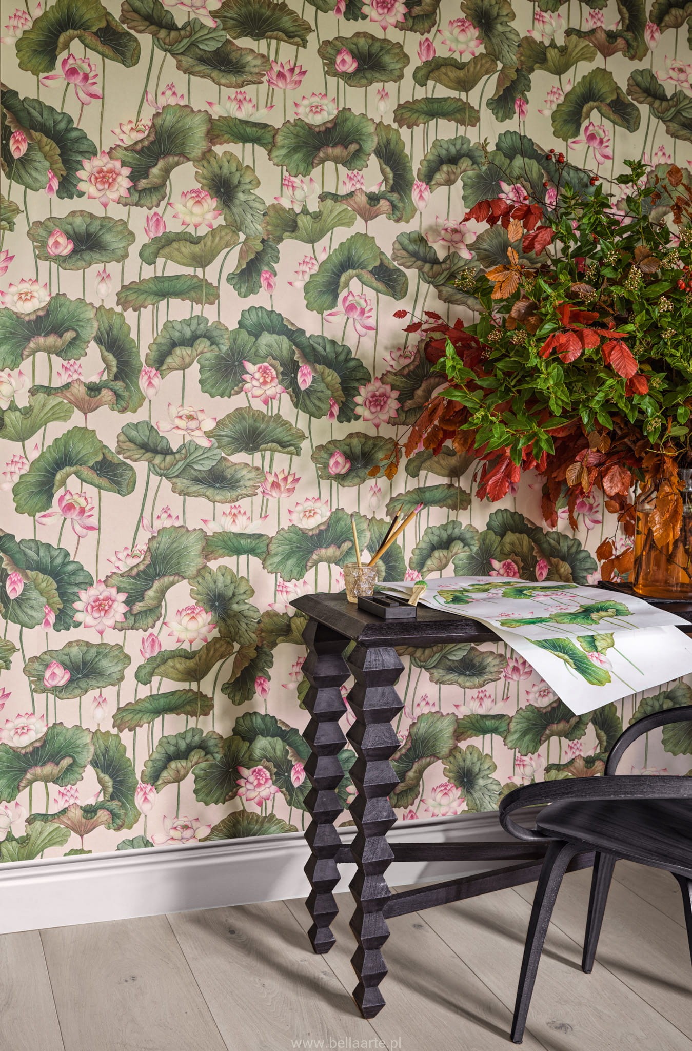 Wzór inspirowany jest Świątynią Ryoanji i pięknem wodnych ogrodów w Kioto, gdzie stawy wypełnione są liliami wodnymi, tworząc malowniczy krajobraz. Artyści Cole & Son uchwycili kwiatową choreografię lilii wodnych, które symbolizują „pokój” i „oświecenie”. Projekt Lily Lotus ożywia przestrzeń, wprowadzając w nią delikatny ruch, gdy kwiaty przeplatają się i tańczą na ścianach, dodając wnętrzom harmonii i elegancji.