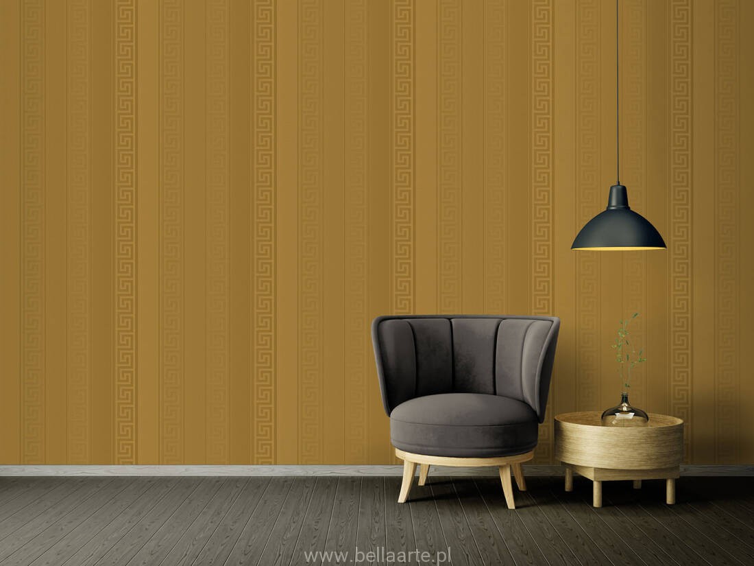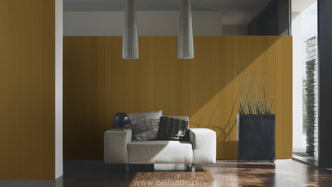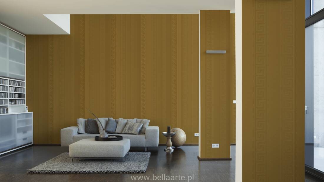 Wzór geometryczny "meander grecki" jest również charakterystyczny dla marki Versace. Tym razem klucze wkomponowano w ponadczasowe pasy. Ornamenty na tapecie grają ze światłem tworząc niepowtarzalny klimat.