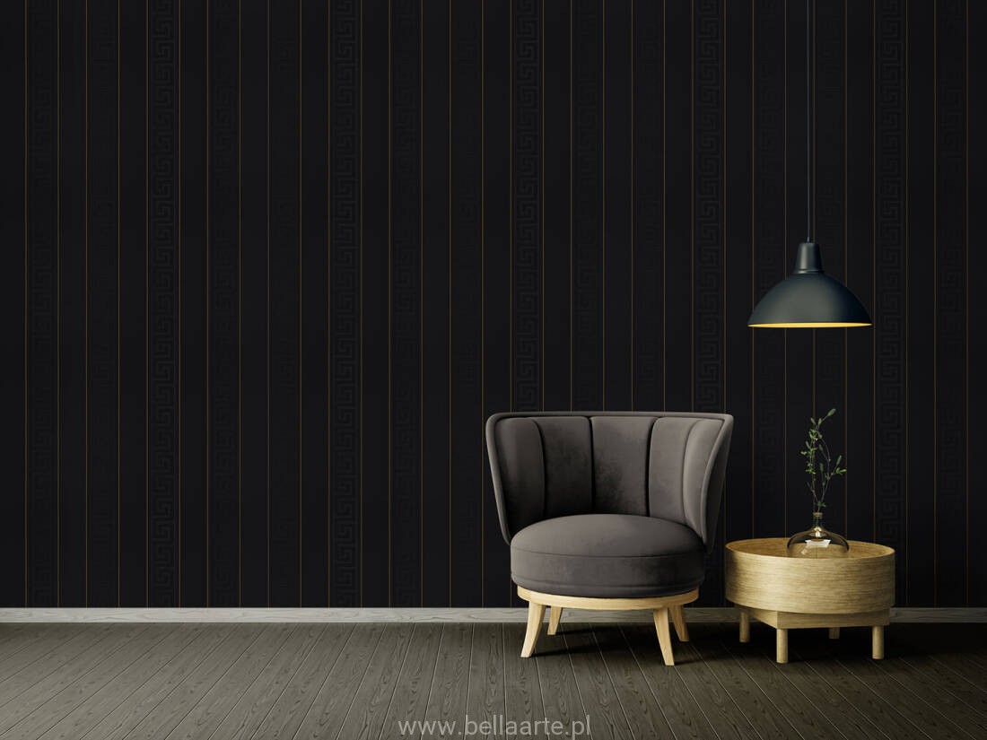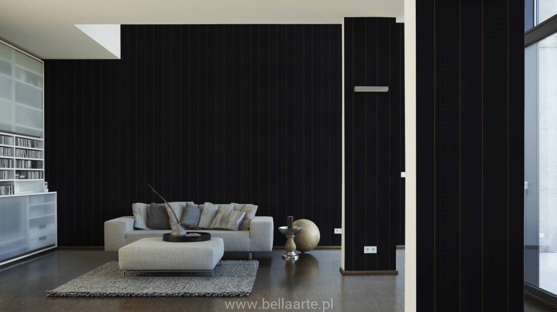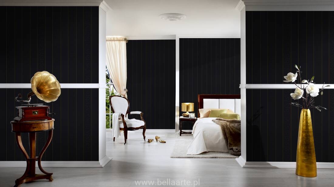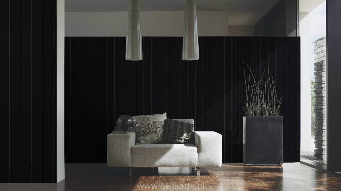 Wzór geometryczny "meander grecki" jest również charakterystyczny dla marki Versace. Tym razem klucze wkomponowano w ponadczasowe pasy. Ornamenty na tapecie grają ze światłem tworząc niepowtarzalny klimat.
