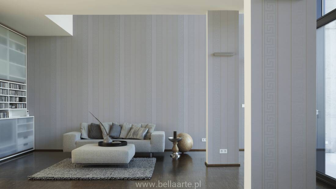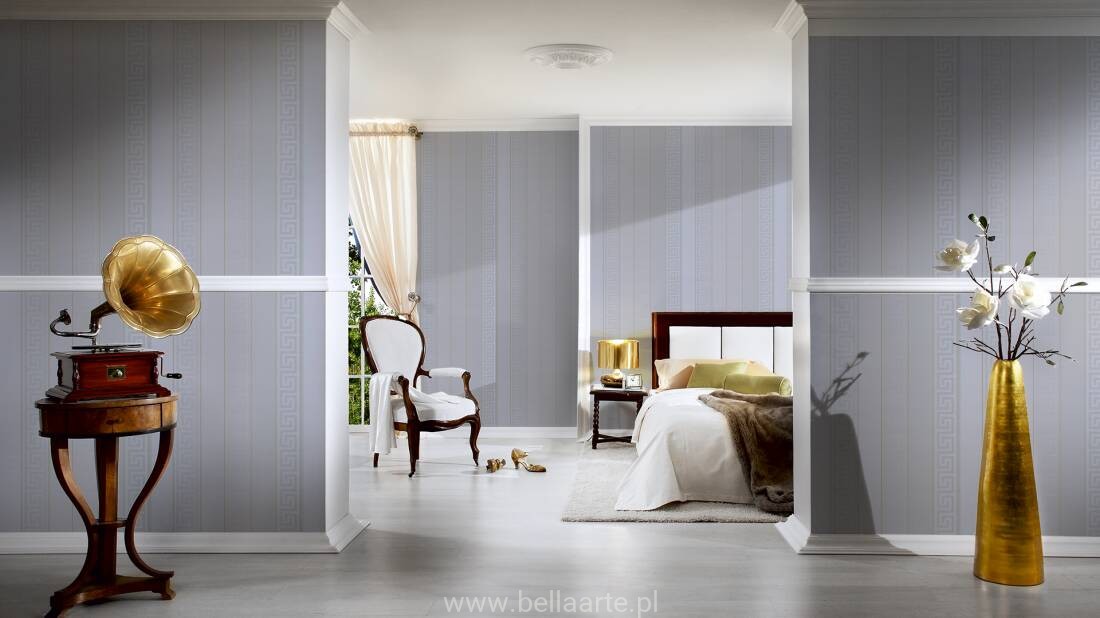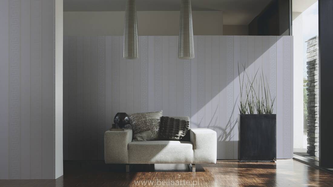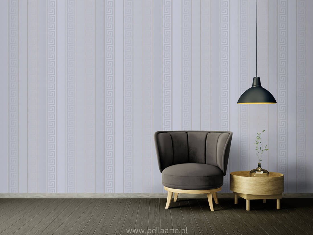 Wzór geometryczny "meander grecki" jest również charakterystyczny dla marki Versace. Tym razem klucze wkomponowano w ponadczasowe pasy. Ornamenty na tapecie grają ze światłem tworząc niepowtarzalny klimat.