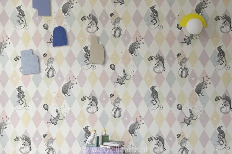 Tapeta w romby, ręcznie rysowane zwierzęta tworzą spektakularny cyrkowy pokaz.