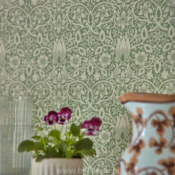 Tapeta Borage to historyczny wzór Williama Morrisa z 1883 roku, po raz pierwszy przeniesiony na powierzchnię ściany. Kompozycja oparta jest na wyraźnej osi symetrii, co nadaje jej uporządkowany, a jednocześnie dynamiczny charakter. Delikatne, kwitnące łodygi tworzą gęsty układ florystyczny, który stanowi klasyczny przykład, czym jest tapeta roślinny ornament Morris & Co.