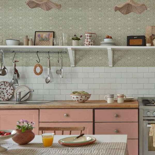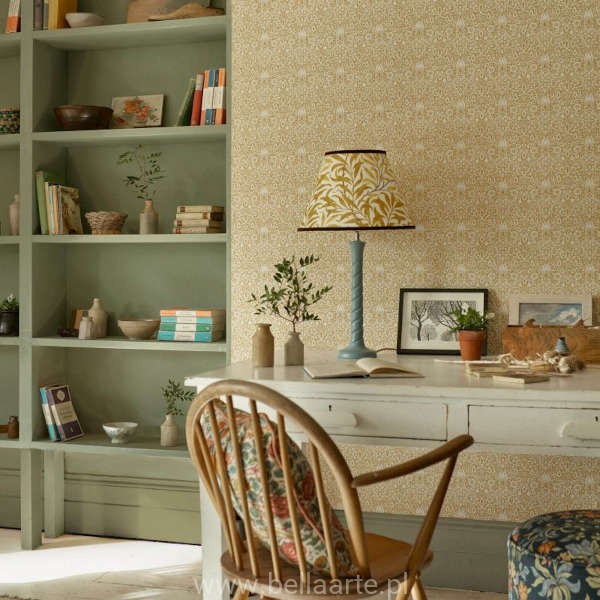 Tapeta Borage to historyczny wzór Williama Morrisa z 1883 roku, po raz pierwszy przeniesiony na powierzchnię ściany. Kompozycja oparta jest na wyraźnej osi symetrii, co nadaje jej uporządkowany, a jednocześnie dynamiczny charakter. Delikatne, kwitnące łodygi tworzą gęsty układ florystyczny, który stanowi klasyczny przykład, czym jest tapeta roślinny ornament Morris & Co.