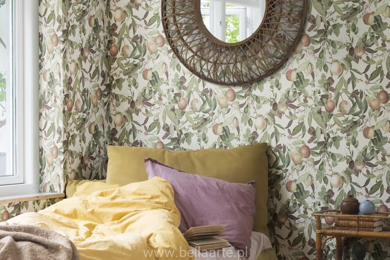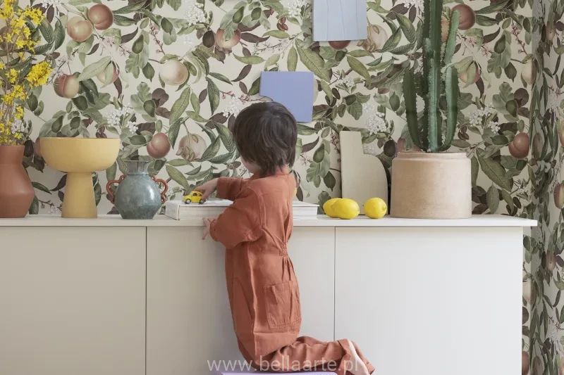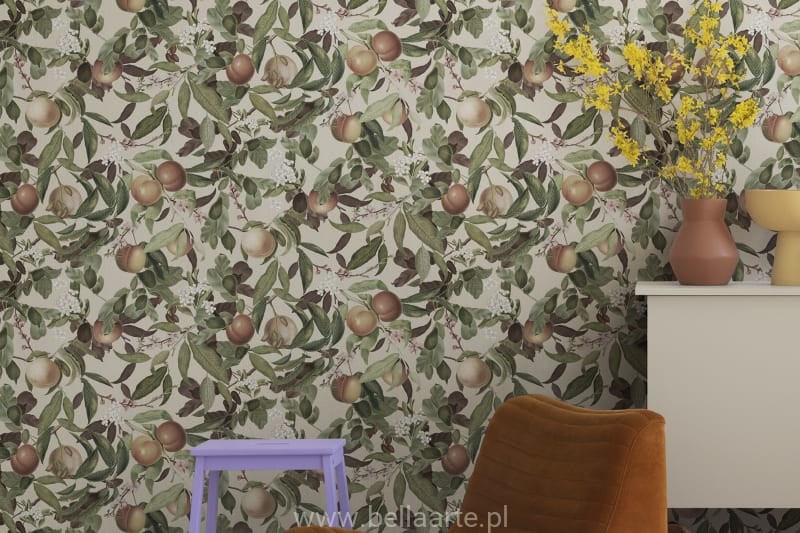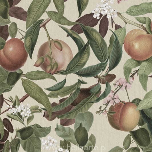 Kwiaty i dojrzałe brzoskwinie we wzorze Peach Valley Sand.