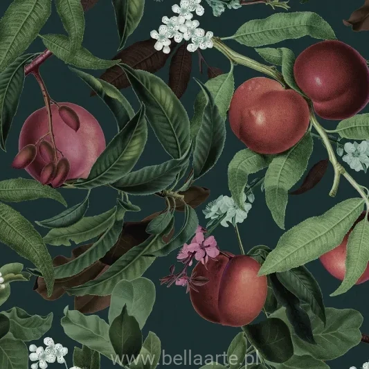 Kwiaty i dojrzałe brzoskwinie we wzorze Peach Valley Sand.