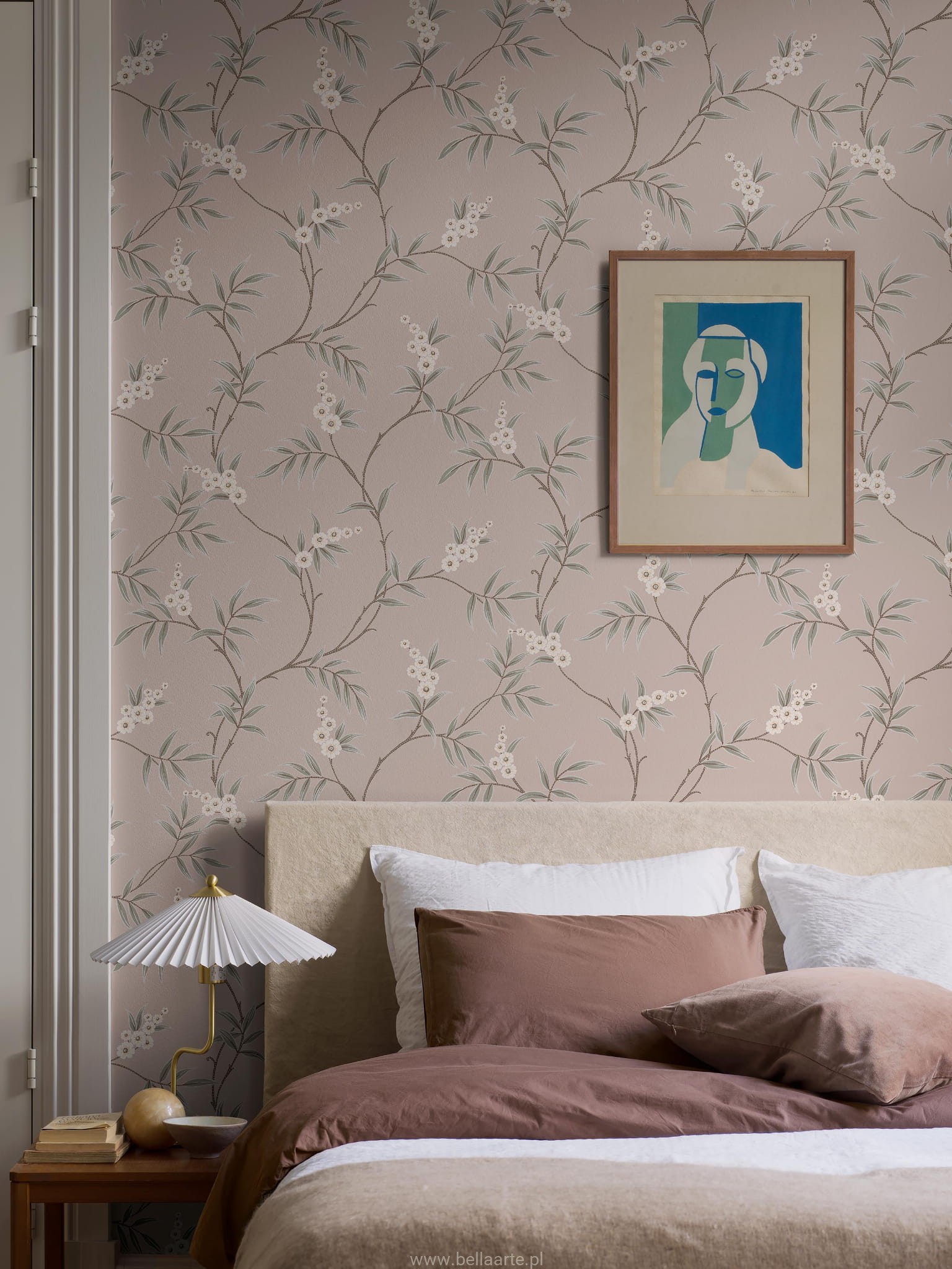 Tapeta Floral Tree marki Boråstapeter to subtelne połączenie botanicznej inspiracji i delikatnej stylistyki Chinoiserie. Wzór przedstawia finezyjne gałązki z liśćmi i kwiatami, tworząc lekką, dekoracyjną kompozycję o harmonijnym, naturalnym charakterze. Dzięki zastosowaniu techniki druku powierzchniowego tapeta zyskuje przyjemną w dotyku fakturę, która dodatkowo podkreśla rękodzielniczy wyraz motywu.