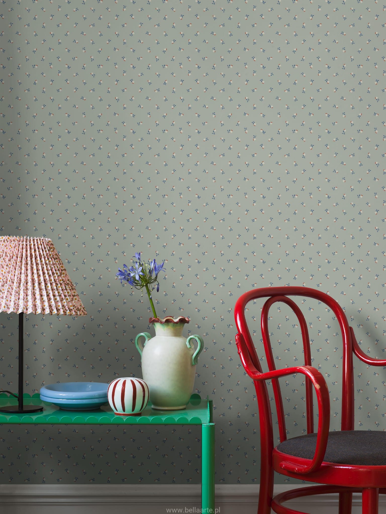 Tapeta w małe kwiatki sprawdzi się zarówno w sypialni, jak i w salonie, gabinecie czy przedpokoju, tworząc spokojne, eleganckie tło dla codziennego życia. Jej dyskretny, ale wyrazisty wzór przyciąga uwagę, nie dominując przy tym całej aranżacji.